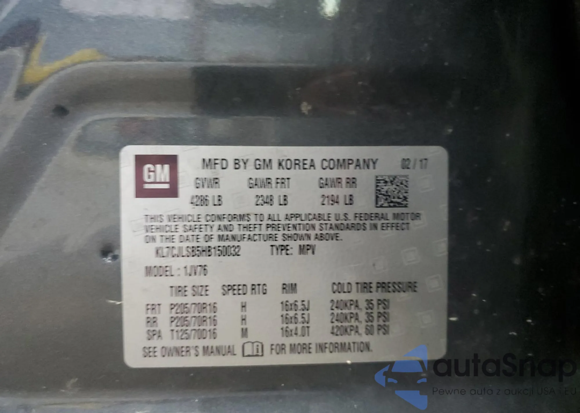VIN: KL7CJLSB5HB150032