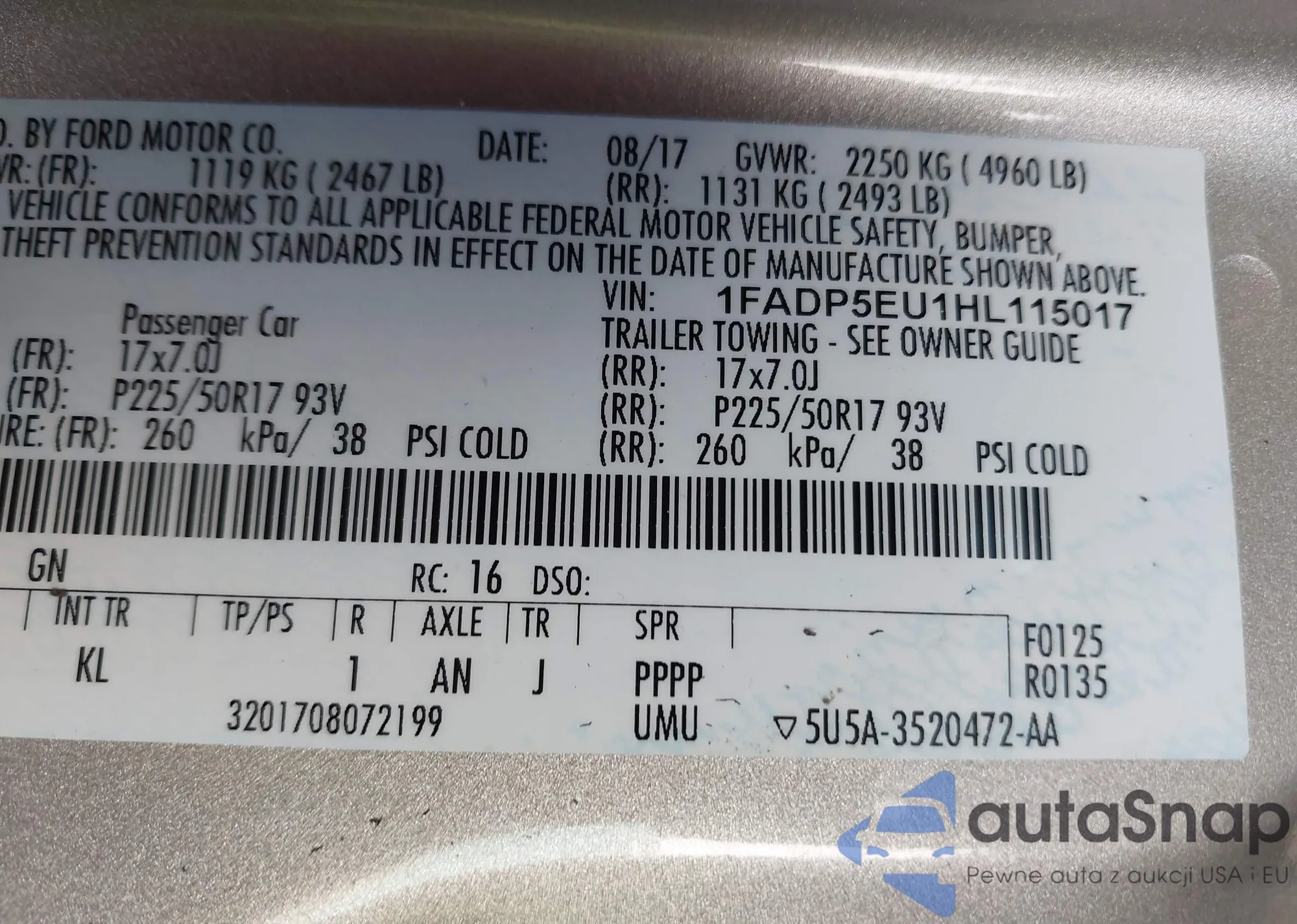 The car Ford C-MAX 2017 (VIN 1FADP5EU1HL115017) has not been auctioned before. The documents are clean, and the mileage matches or is below the market average. Sold by an insurance company – we recommend purchase. Delivery to the port will take approx. 6–8 weeks.