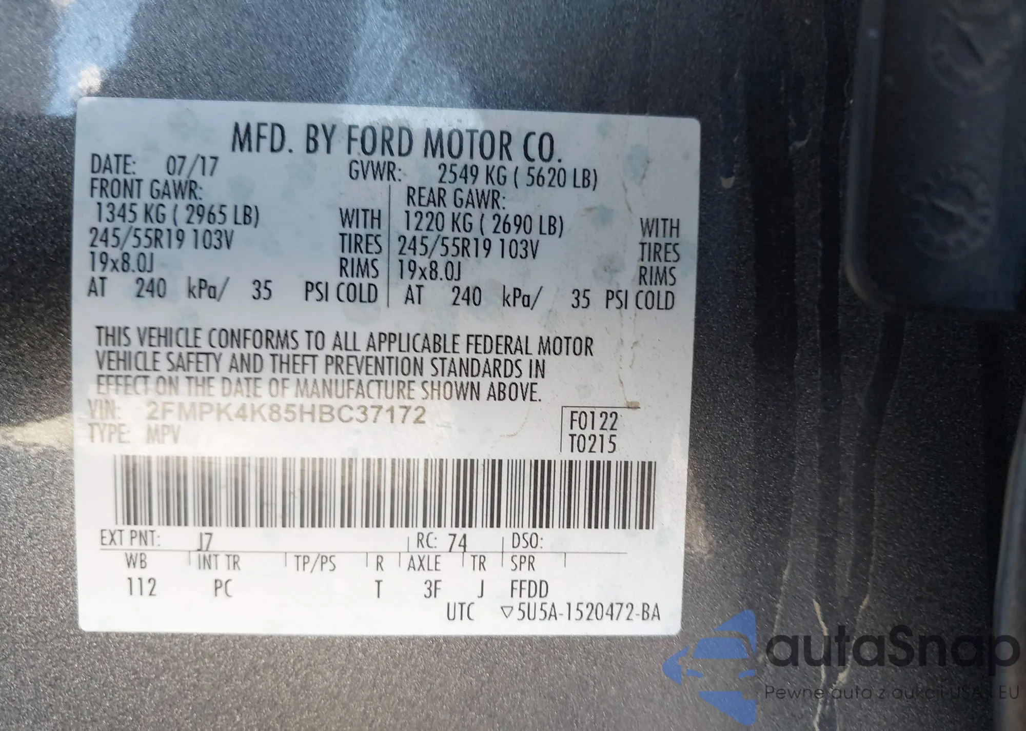 The car Ford Edge 2017 (VIN 2FMPK4K85HBC37172) has not been auctioned before. The documents are clean, and the mileage matches or is below the market average. Sold by an insurance company – we recommend purchase. Delivery to the port will take approx. 6–8 weeks.