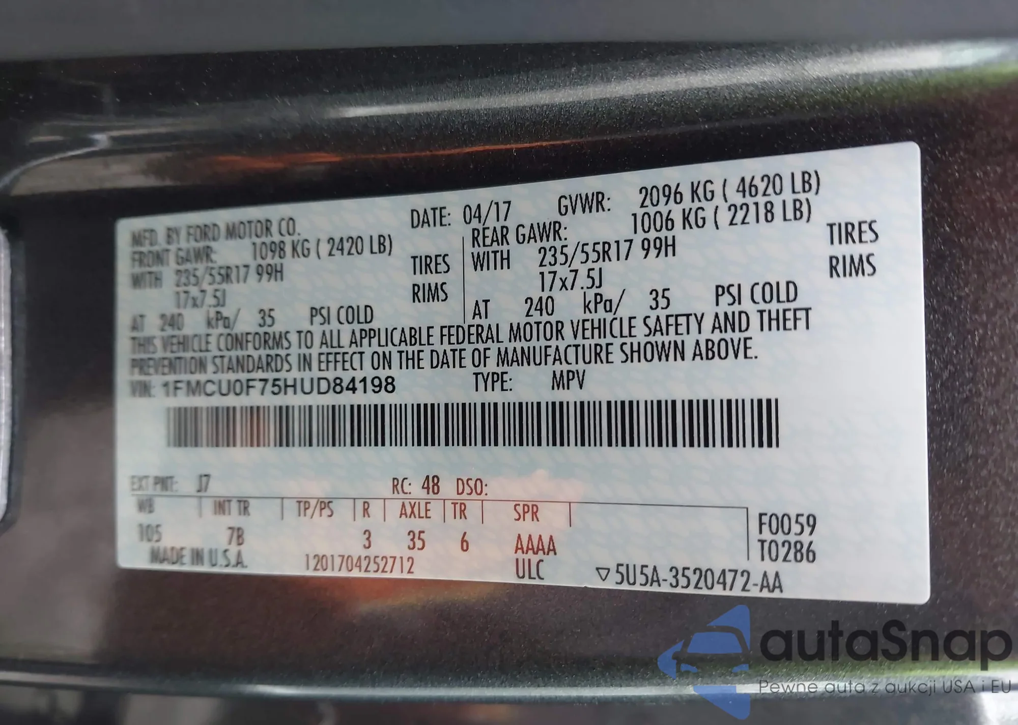 VIN: 1FMCU0F75HUD84198
