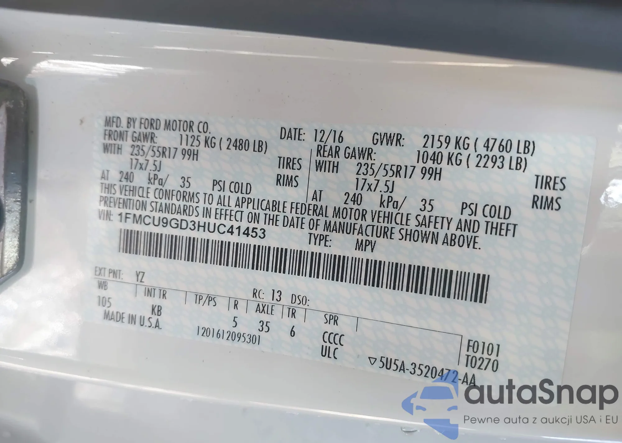 VIN: 1FMCU9GD3HUC41453