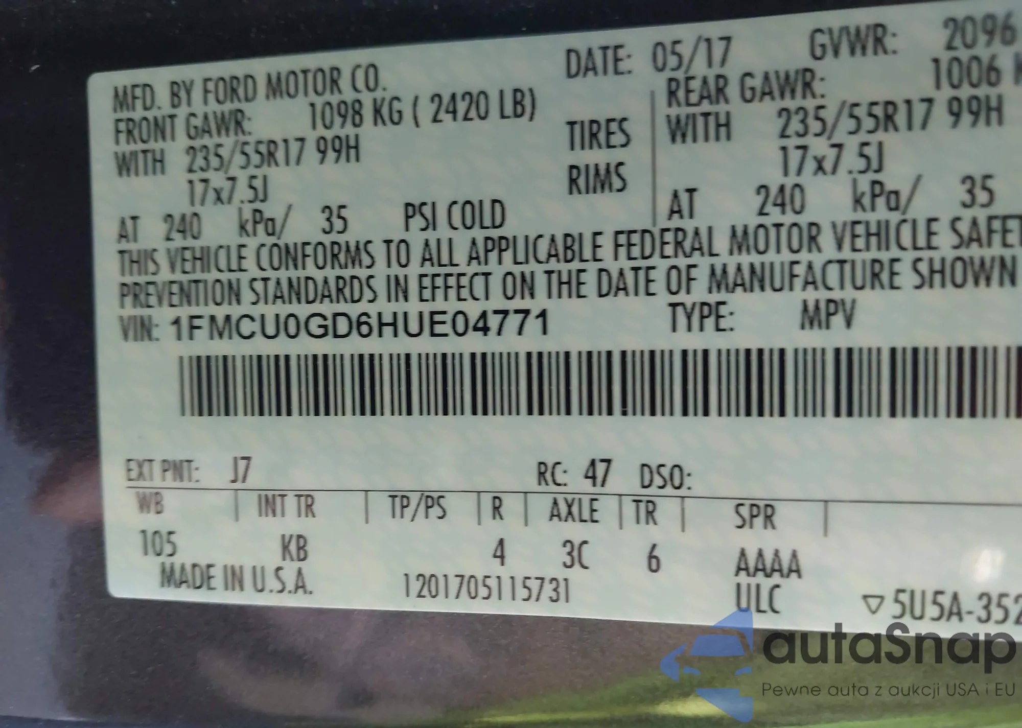The car Ford Escape 2017 (VIN 1FMCU0GD6HUE04771) has not been auctioned before. The documents are clean, and the mileage matches or is below the market average. Sold by an insurance company – we recommend purchase. Delivery to the port will take approx. 6–8 weeks.