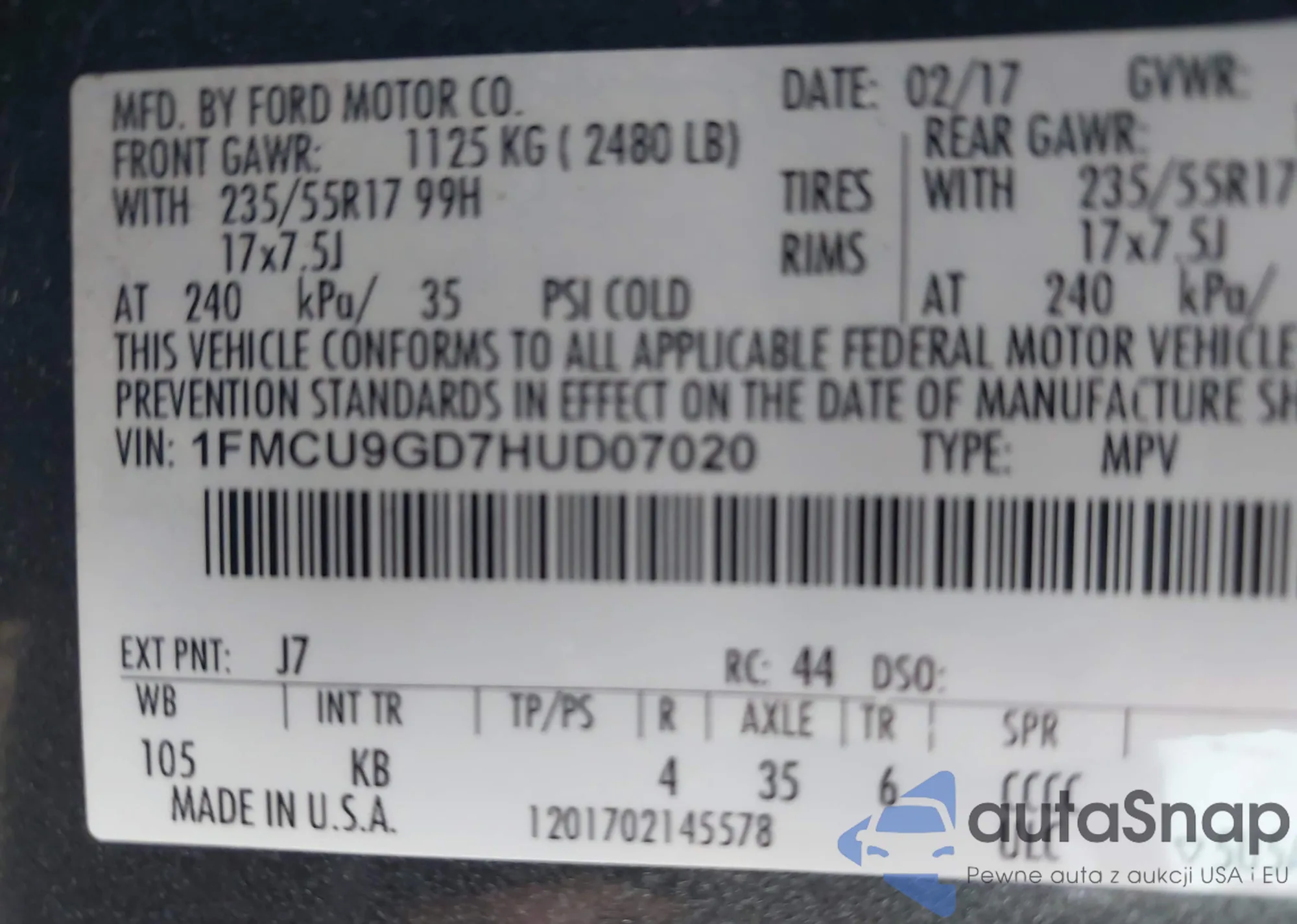 VIN: 1FMCU9GD7HUD07020