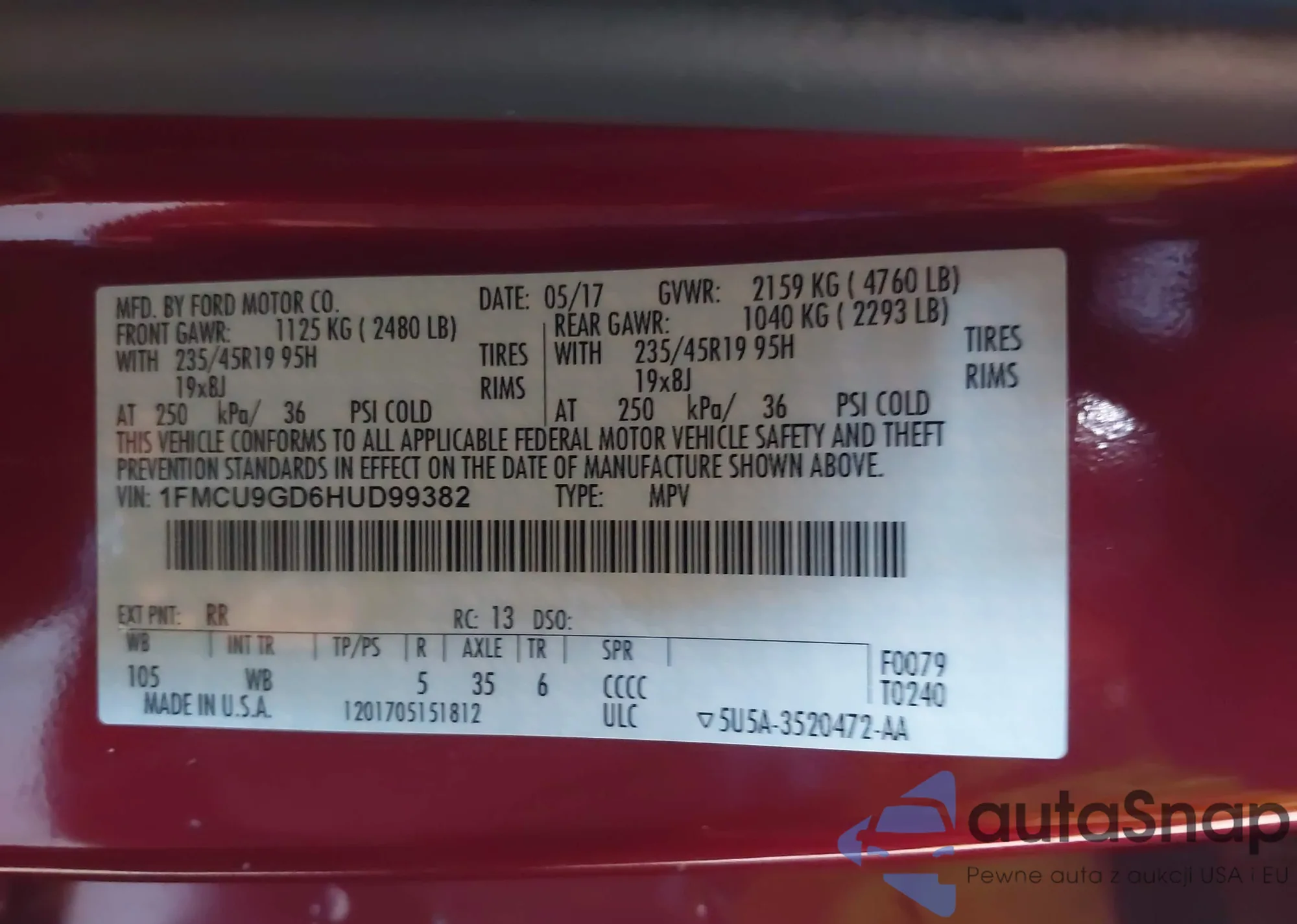 VIN: 1FMCU9GD6HUD99382