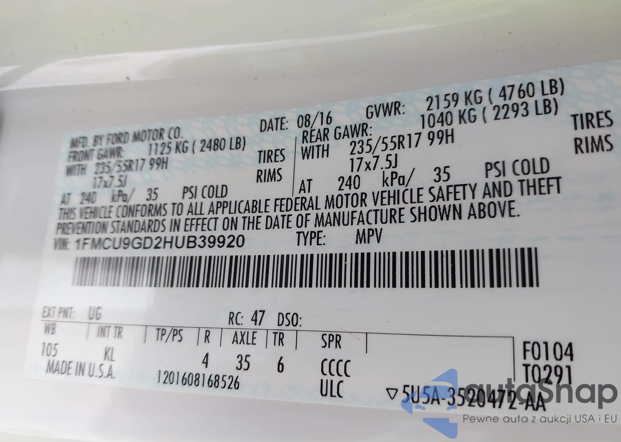 VIN: 1FMCU9GD2HUB39920