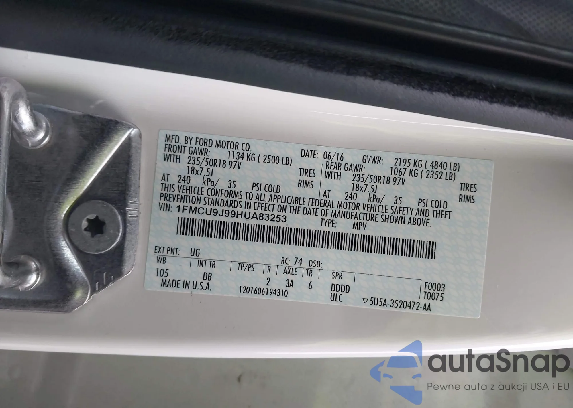 The car Ford Escape 2017 (VIN 1FMCU9J99HUA83253) has documents that prevent registration. Export and registration may be difficult. Contact AutaSnap experts to find alternatives.