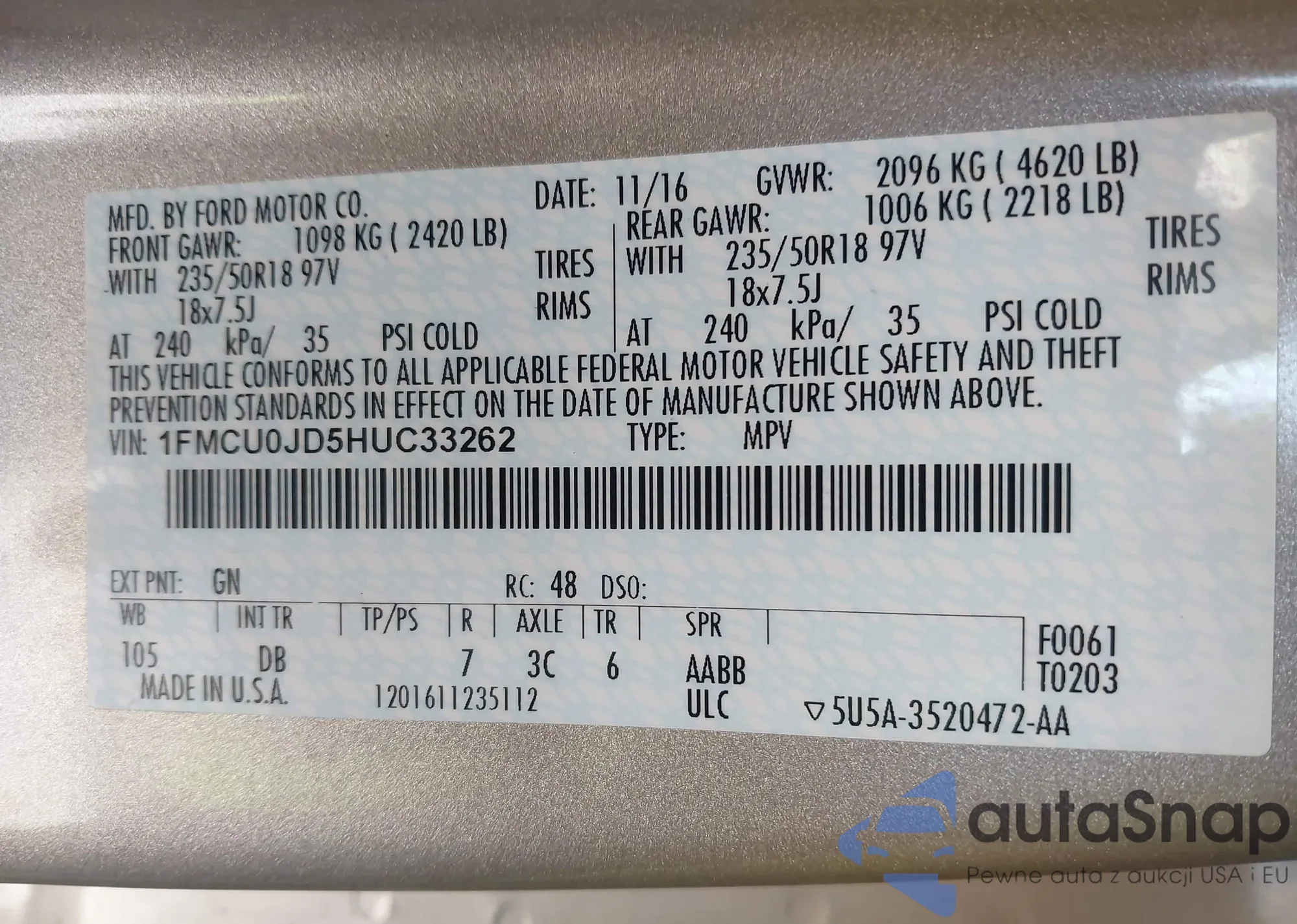 VIN: 1FMCU0JD5HUC33262