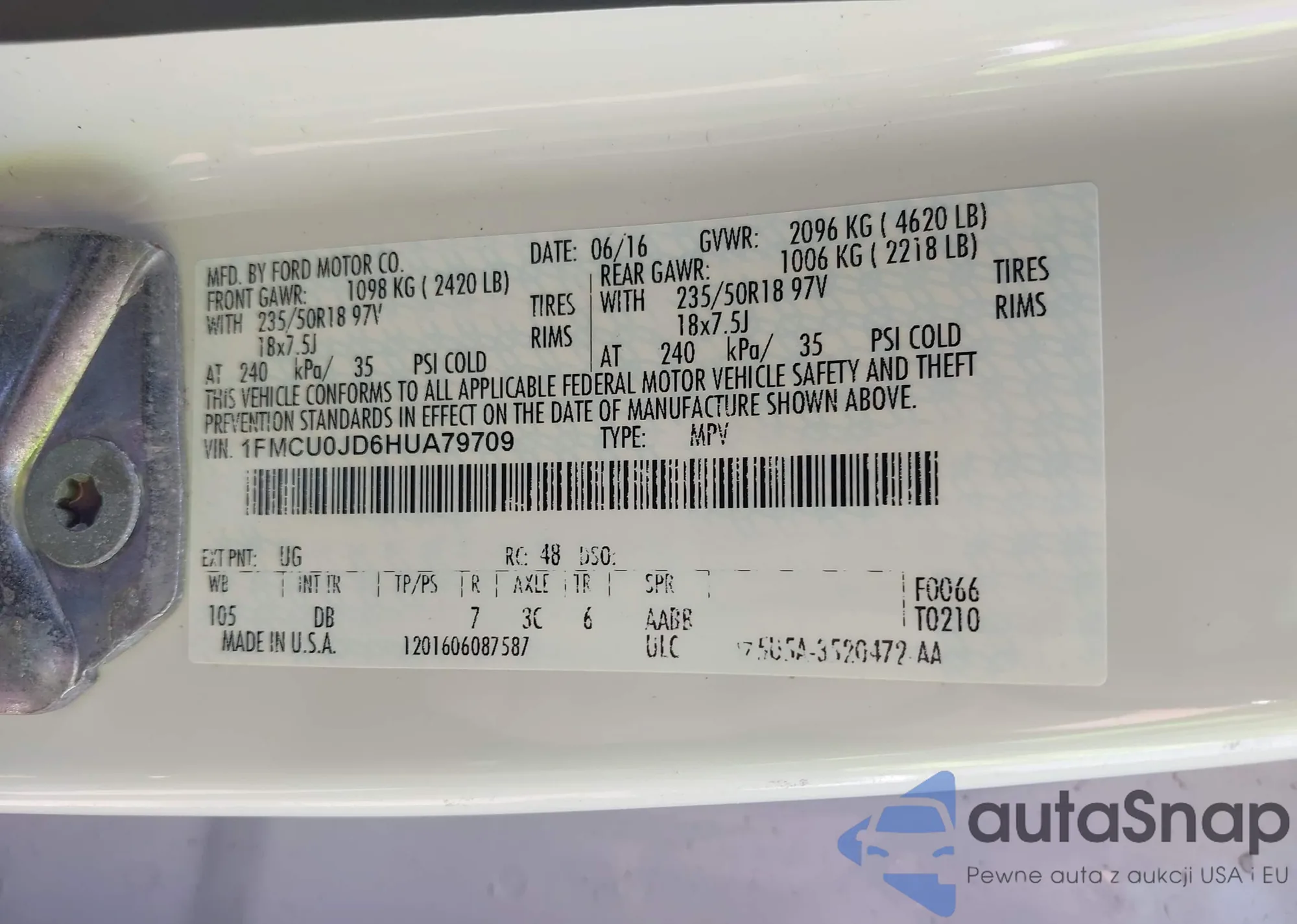 • VIN: 1FMCU0JD6HUA79709