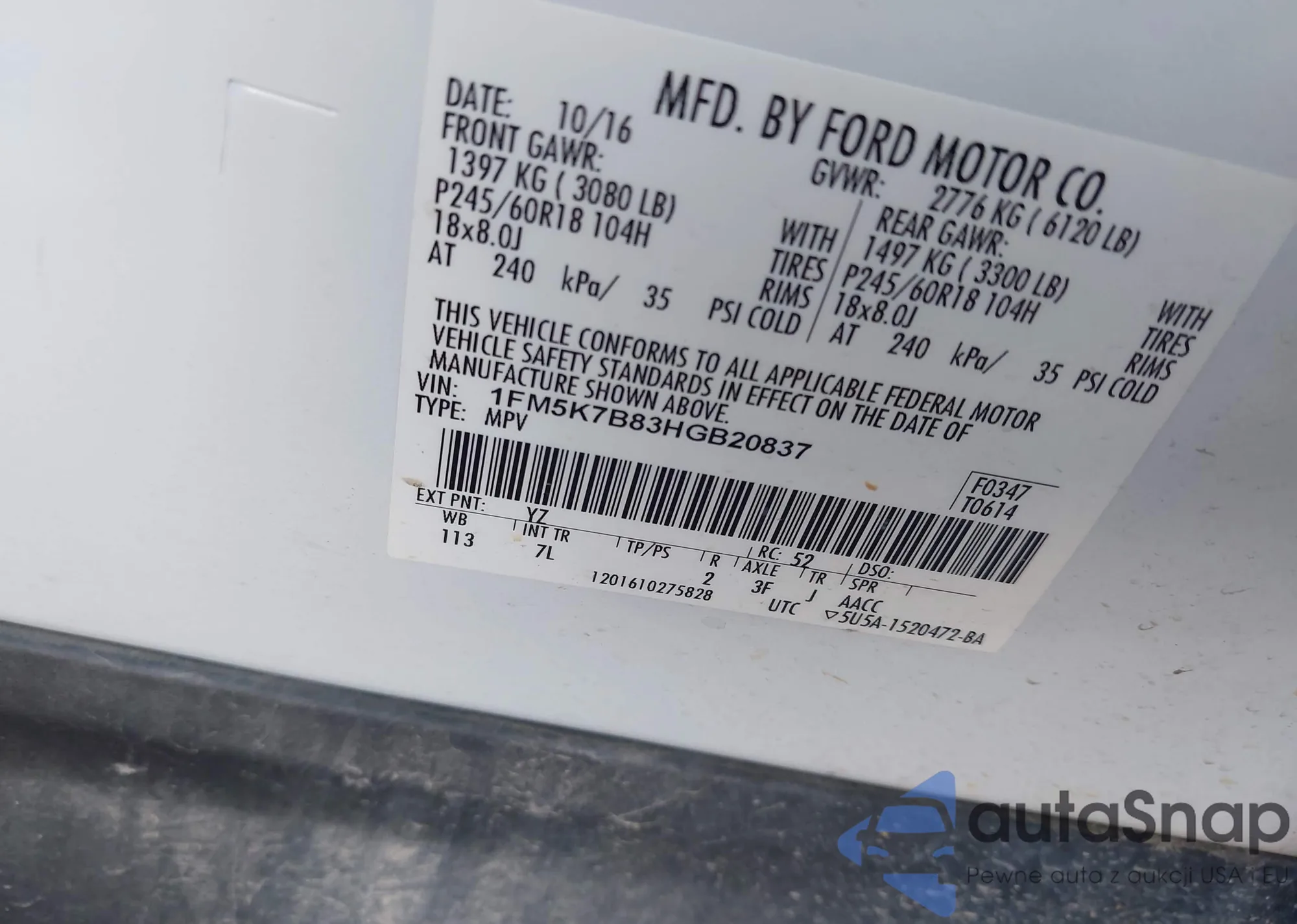 VIN: 1FM5K7B83HGB20837