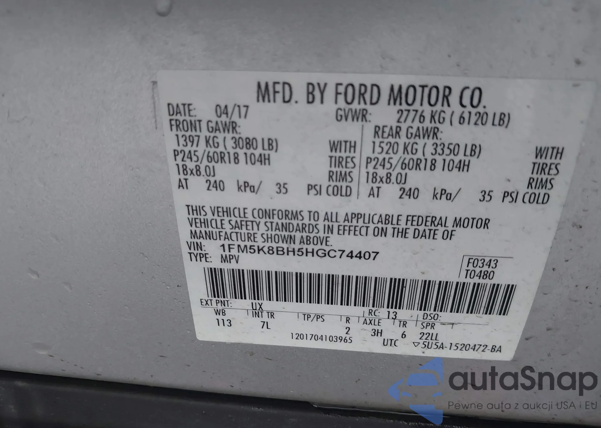 VIN: 1FM5K8BH5HGC74407