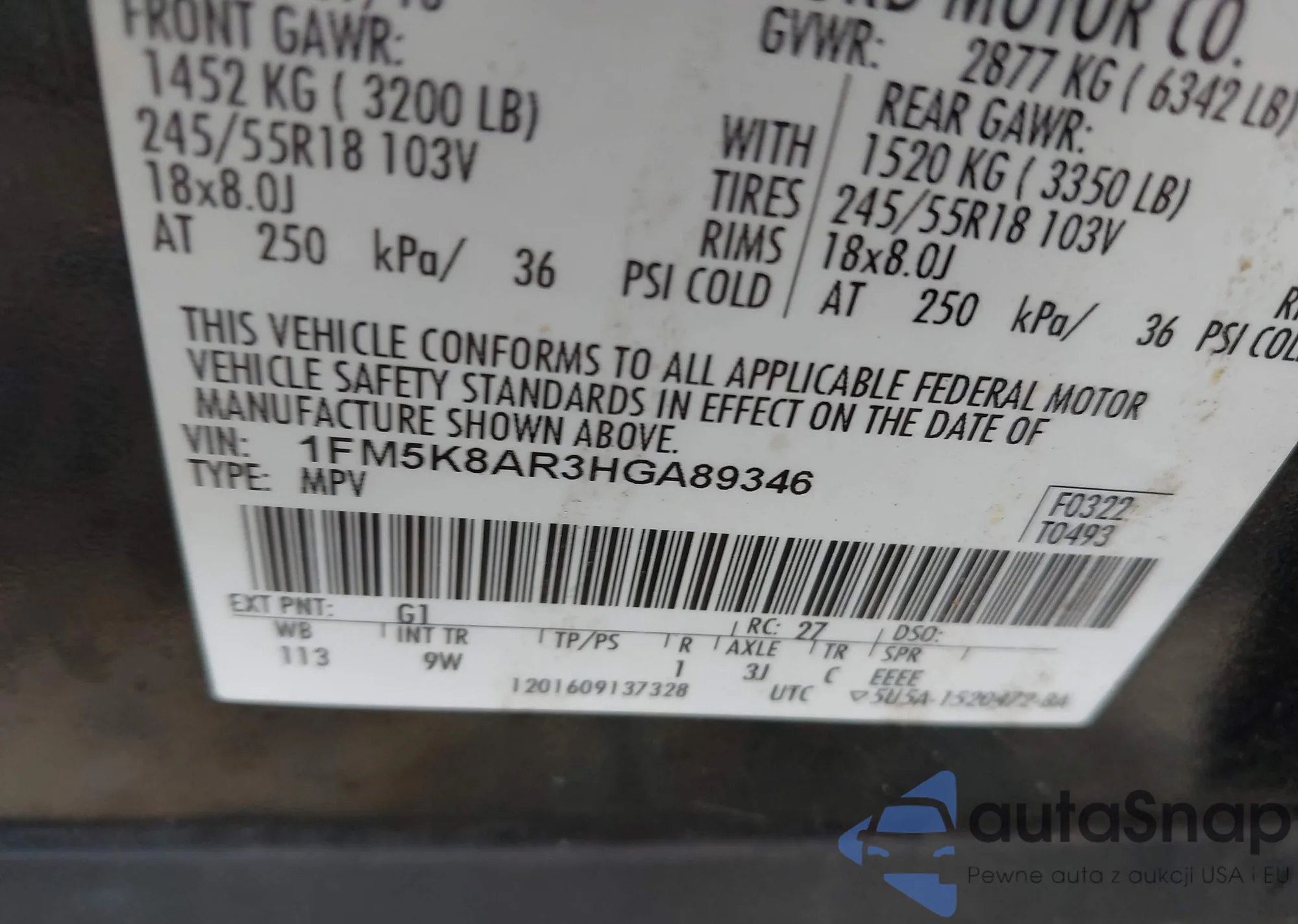 VIN: 1FM5K8AR3HGA89346