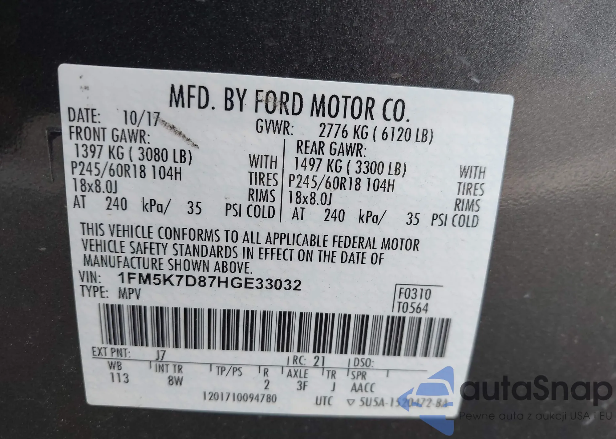 VIN: 1FM5K7D87HGE33032