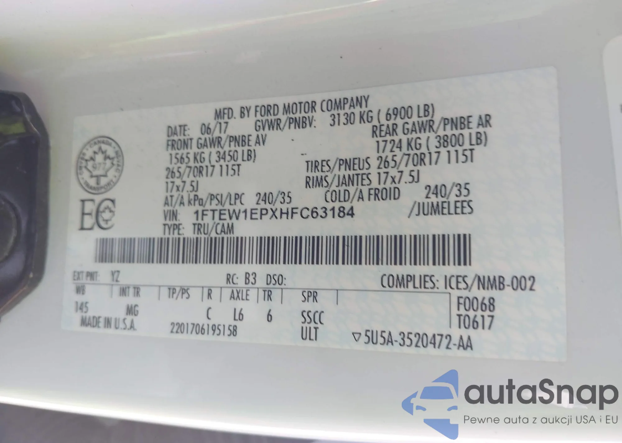 The car Ford F-150 2017 (VIN 1FTEW1EPXHFC63184) has not been auctioned before. The documents are clean, and the mileage matches or is below the market average. Sold by an insurance company – we recommend purchase. Delivery to the port will take approx. 6–8 weeks.