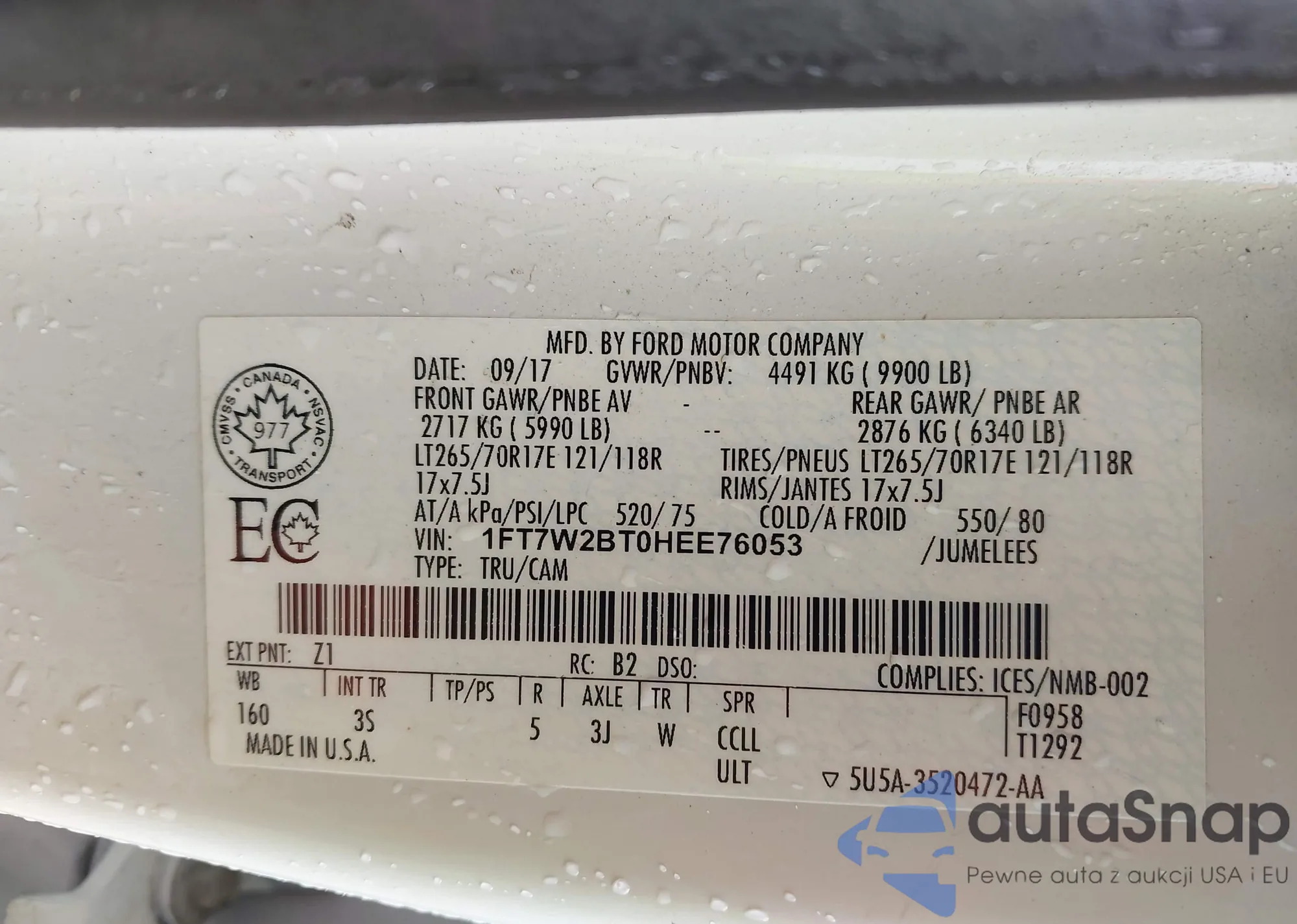 The car Ford F250 2017 (VIN 1FT7W2BT0HEE76053) has not been auctioned before. The documents are clean, and the mileage matches or is below the market average. Sold by an insurance company – we recommend purchase. Delivery to the port will take approx. 6–8 weeks.