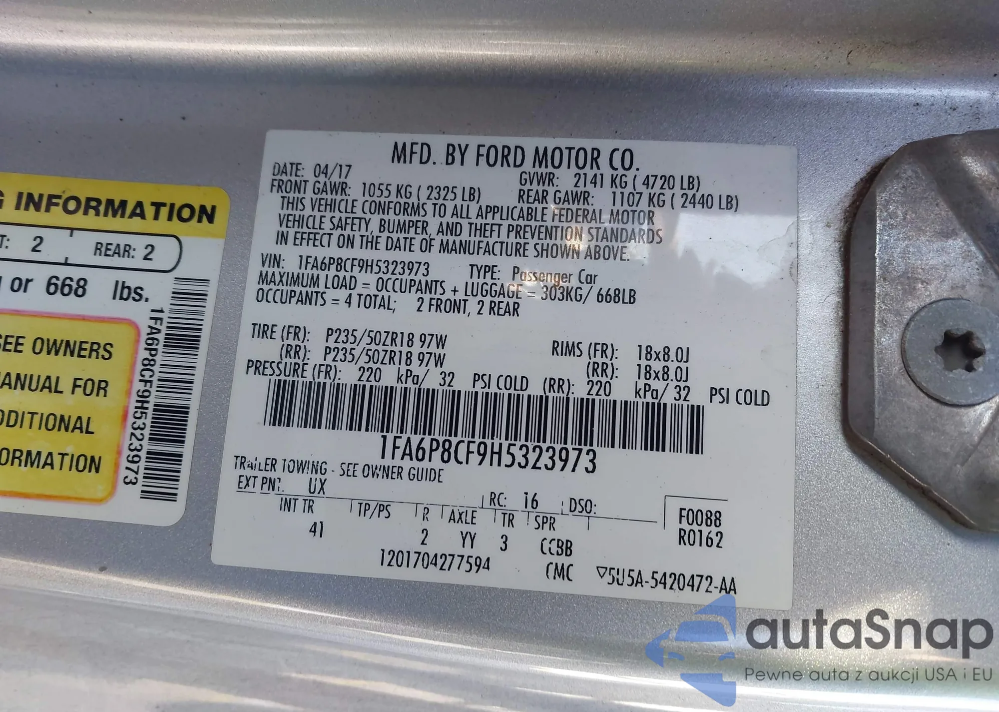 The car Ford Mustang 2017 (VIN 1FA6P8CF9H5323973) has not been auctioned before. The documents are clean, and the mileage matches or is below the market average. Sold by an insurance company – we recommend purchase. Delivery to the port will take approx. 6–8 weeks.
