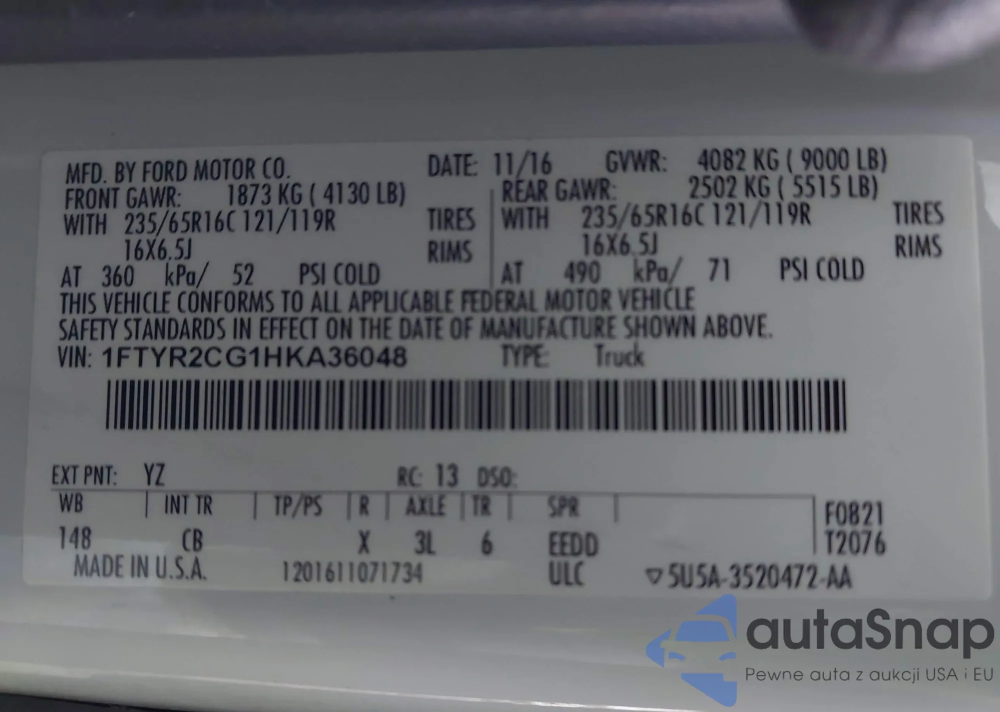 The car Ford Transit 2017 (VIN 1FTYR2CG1HKA36048) has not been auctioned before. The documents are clean, and the mileage matches or is below the market average. Sold by an insurance company – we recommend purchase. Delivery to the port will take approx. 6–8 weeks.