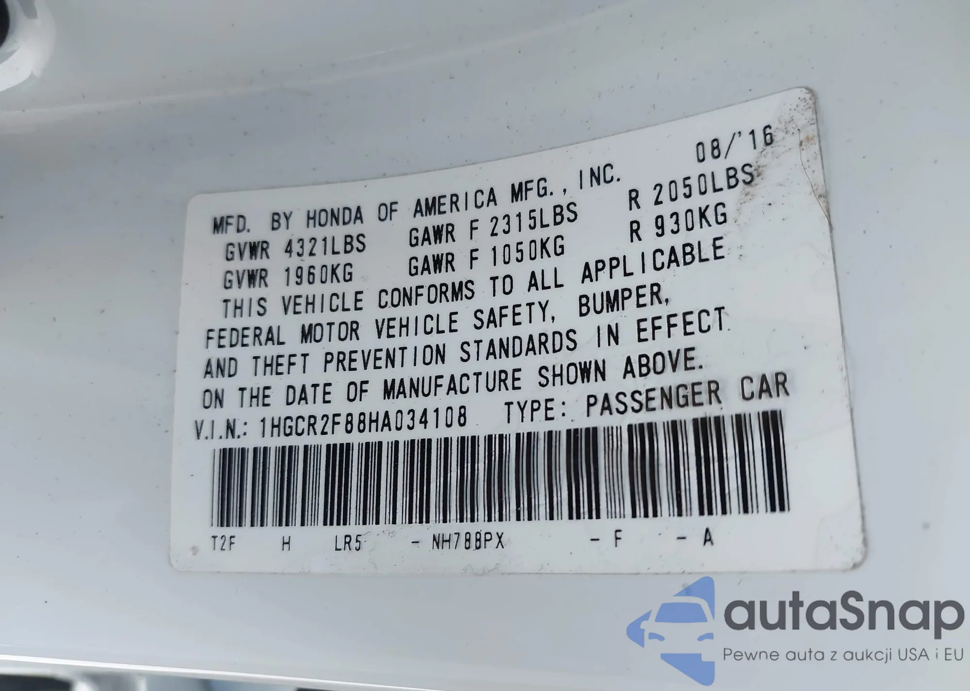 • VIN: 1HGCR2F88HA034108