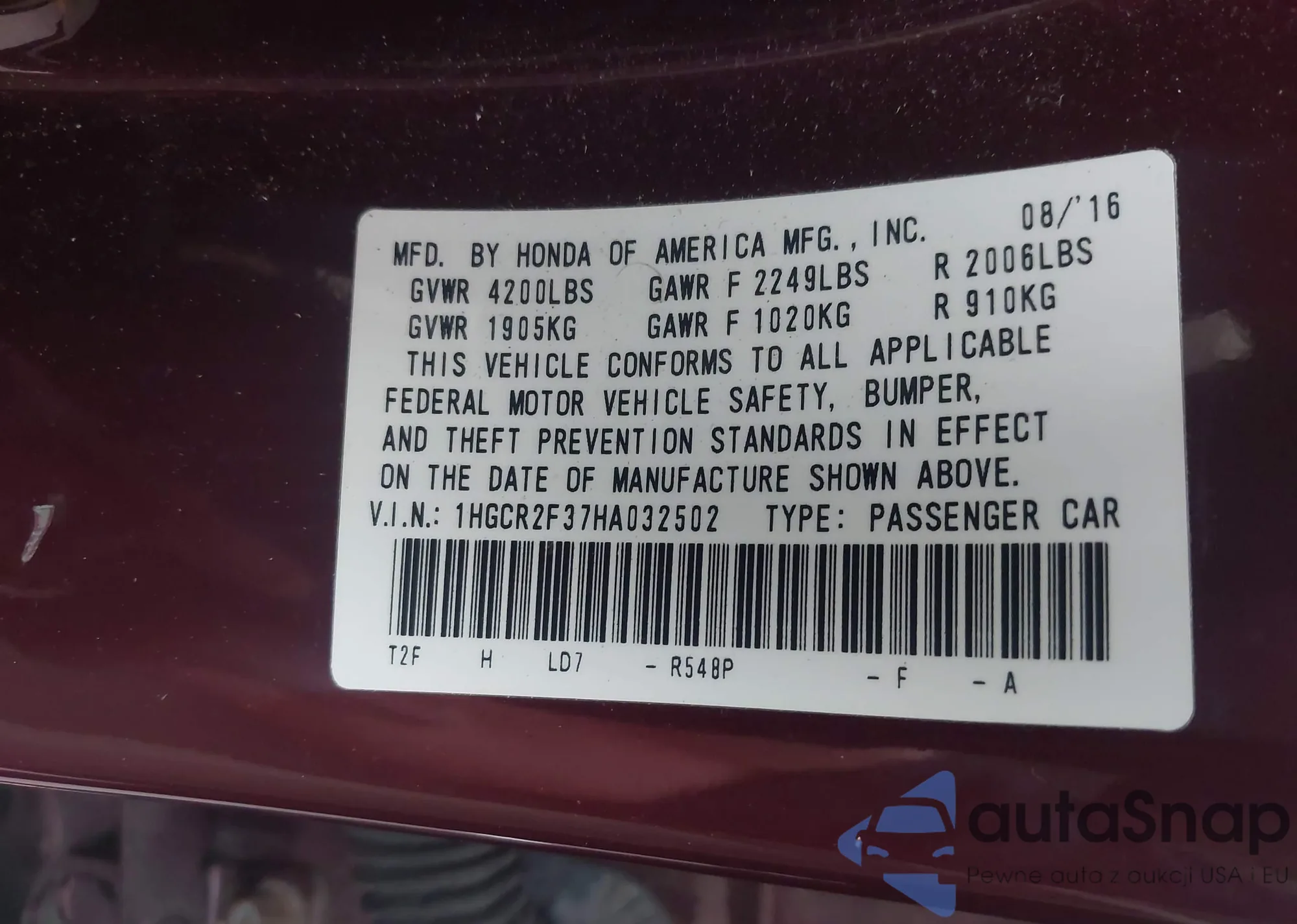 VIN: 1HGCR2F37HA032502