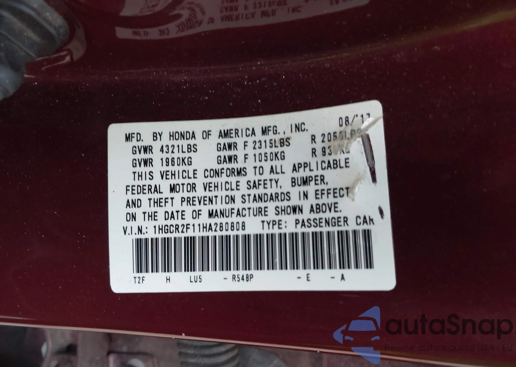 VIN: 1HGCR2F11HA280808