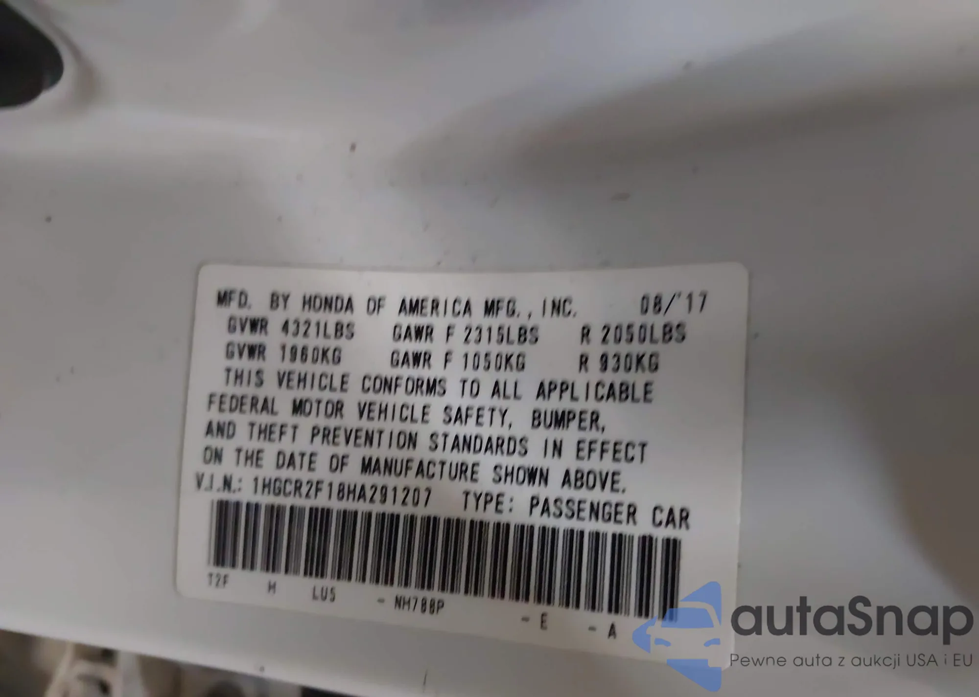 VIN: 1HGCR2F18HA291207