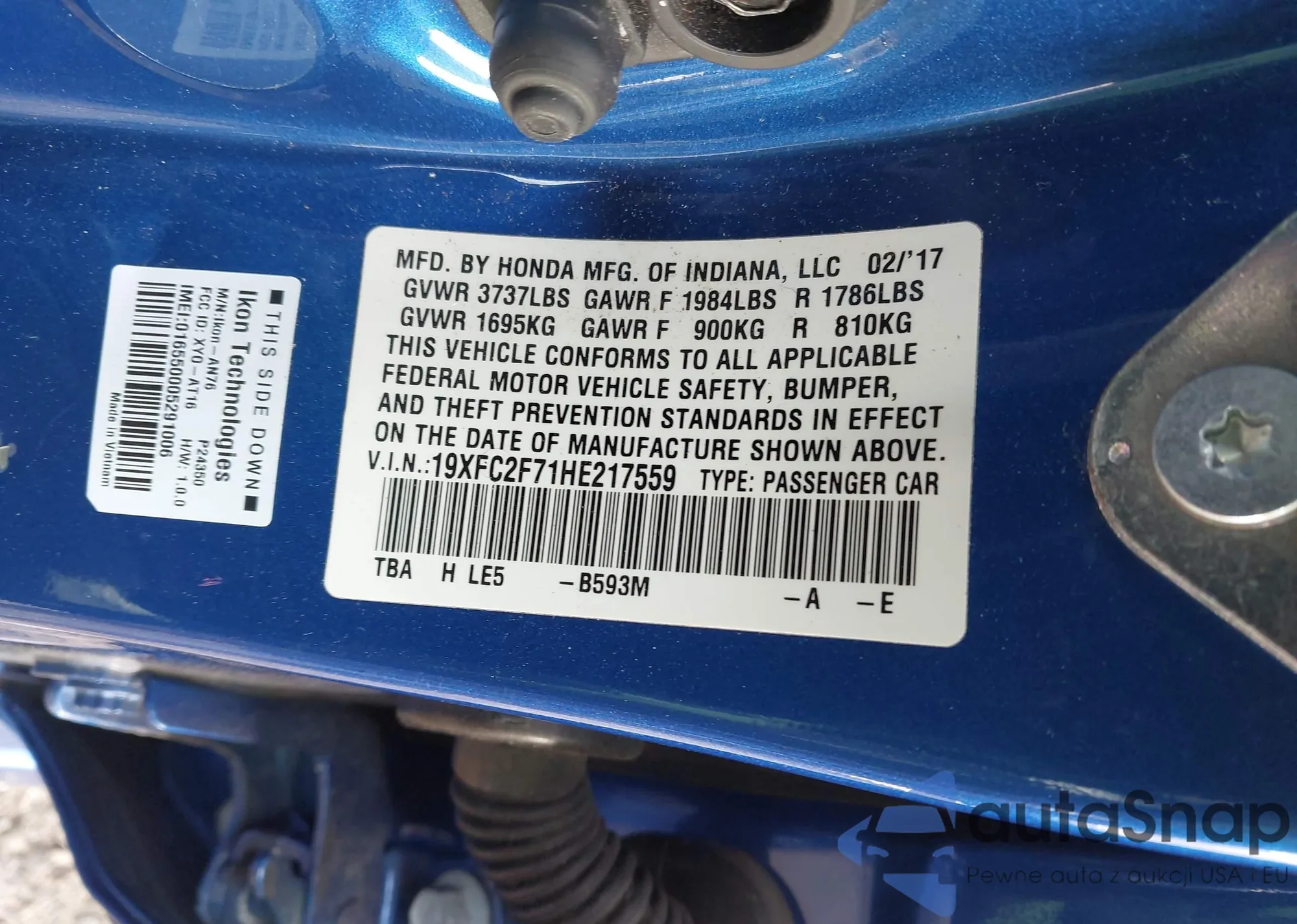 The car Honda Civic 2017 (VIN 19XFC2F71HE217559) has not been auctioned before. The documents are clean, and the mileage matches or is below the market average. Sold by an insurance company – we recommend purchase. Delivery to the port will take approx. 6–8 weeks.