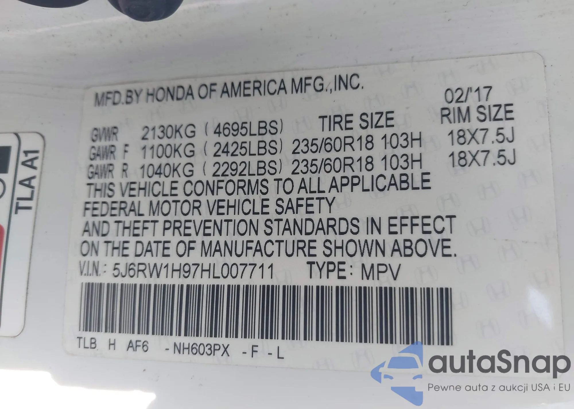 The car Honda CR-V 2017 (VIN 5J6RW1H97HL007711) has not been auctioned before. The documents are clean, and the mileage matches or is below the market average. Sold by an insurance company – we recommend purchase. Delivery to the port will take approx. 6–8 weeks.