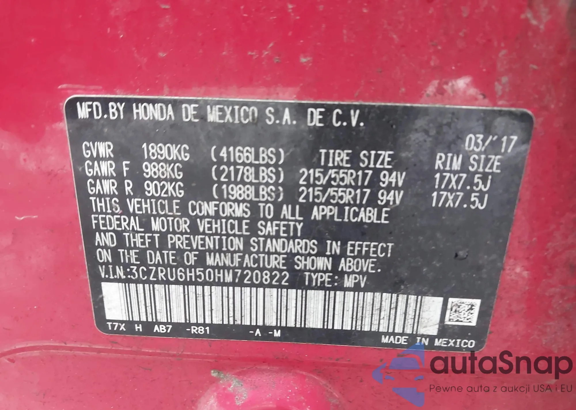 The car Honda HR-V 2017 (VIN 3CZRU6H50HM720822) has not been auctioned before. The documents are clean, and the mileage matches or is below the market average. Sold by an insurance company – we recommend purchase. Delivery to the port will take approx. 6–8 weeks.