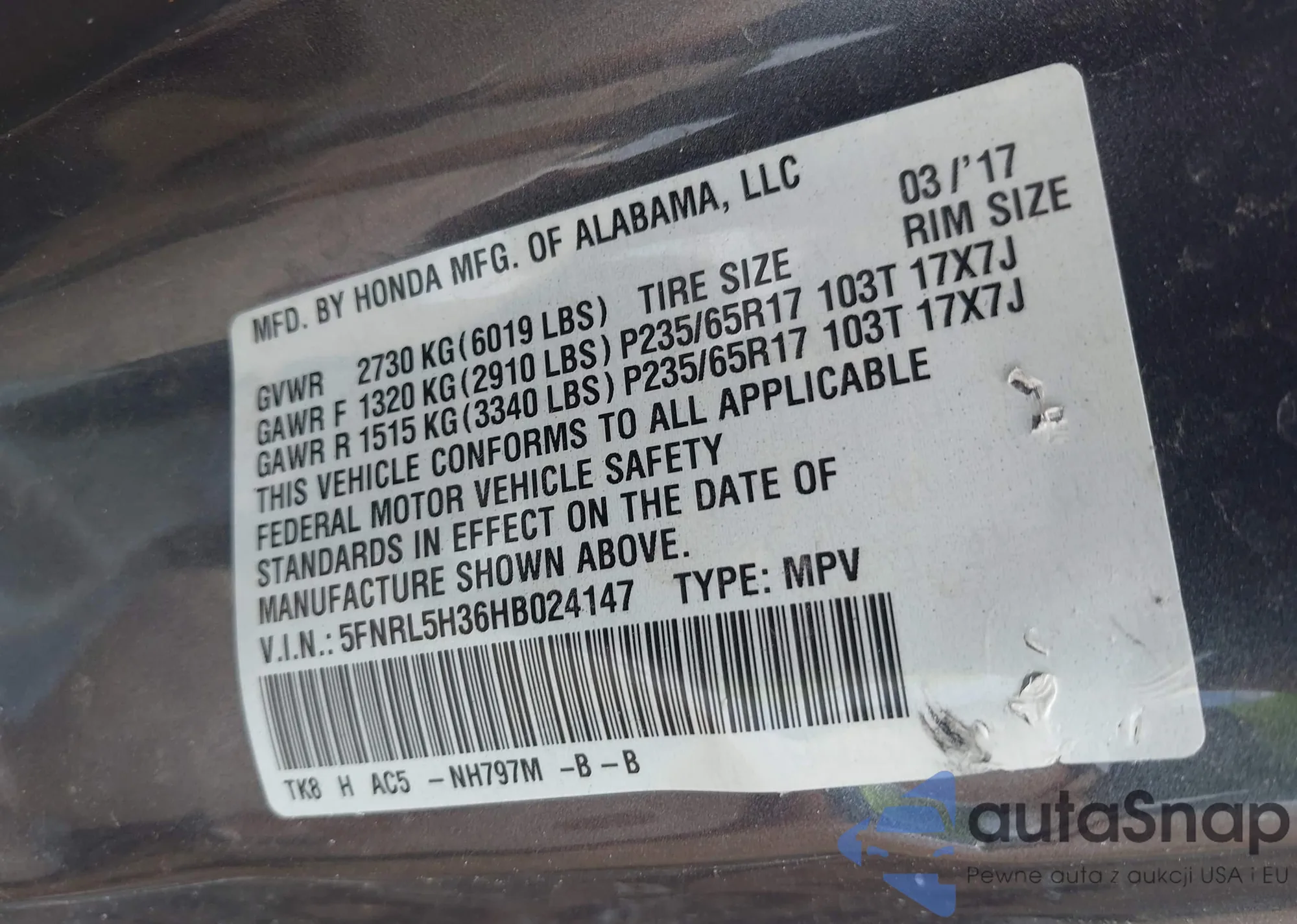 VIN: 5FNRL5H36HB024147