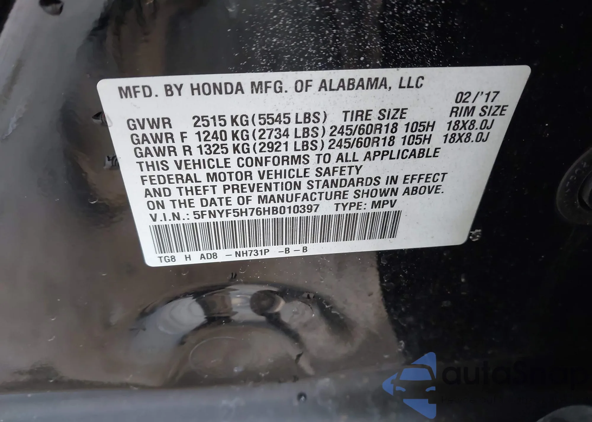 The car Honda Pilot 2017 (VIN 5FNYF5H76HB010397) has not been auctioned before. The documents are clean, and the mileage matches or is below the market average. Sold by an insurance company – we recommend purchase. Delivery to the port will take approx. 6–8 weeks.