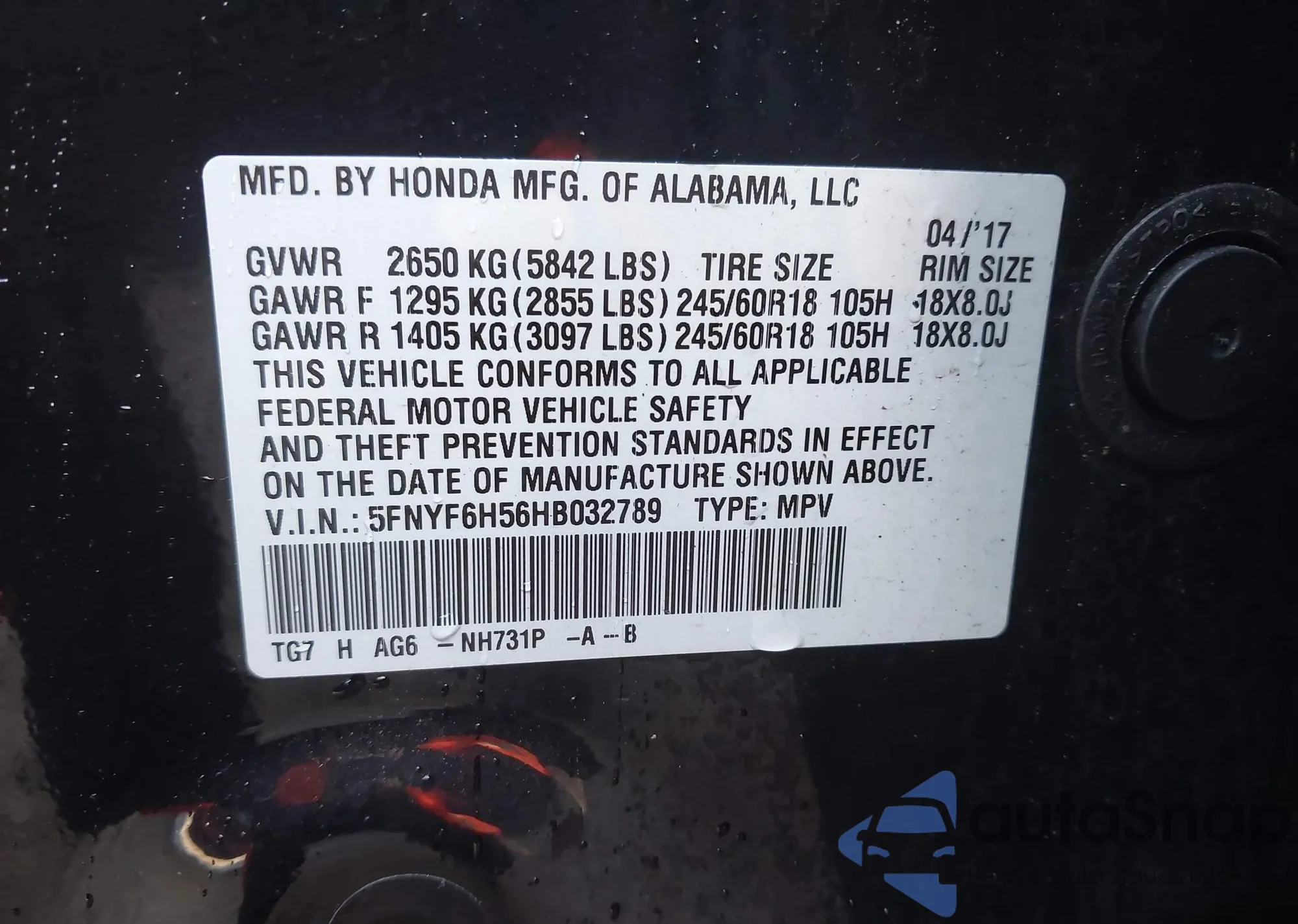 VIN: 5FNYF6H56HB032789