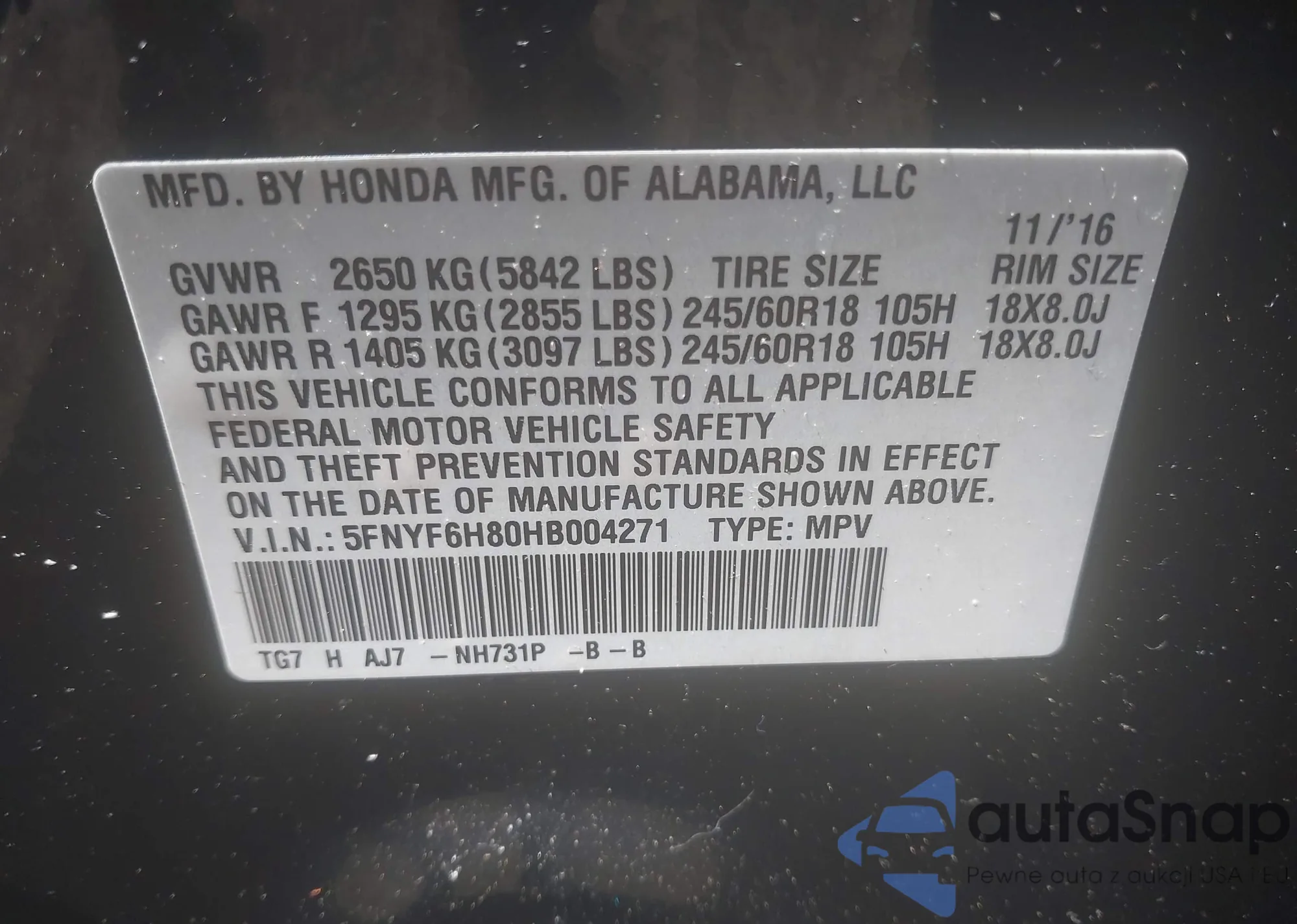 VIN: 5FNYF6H80HB004271