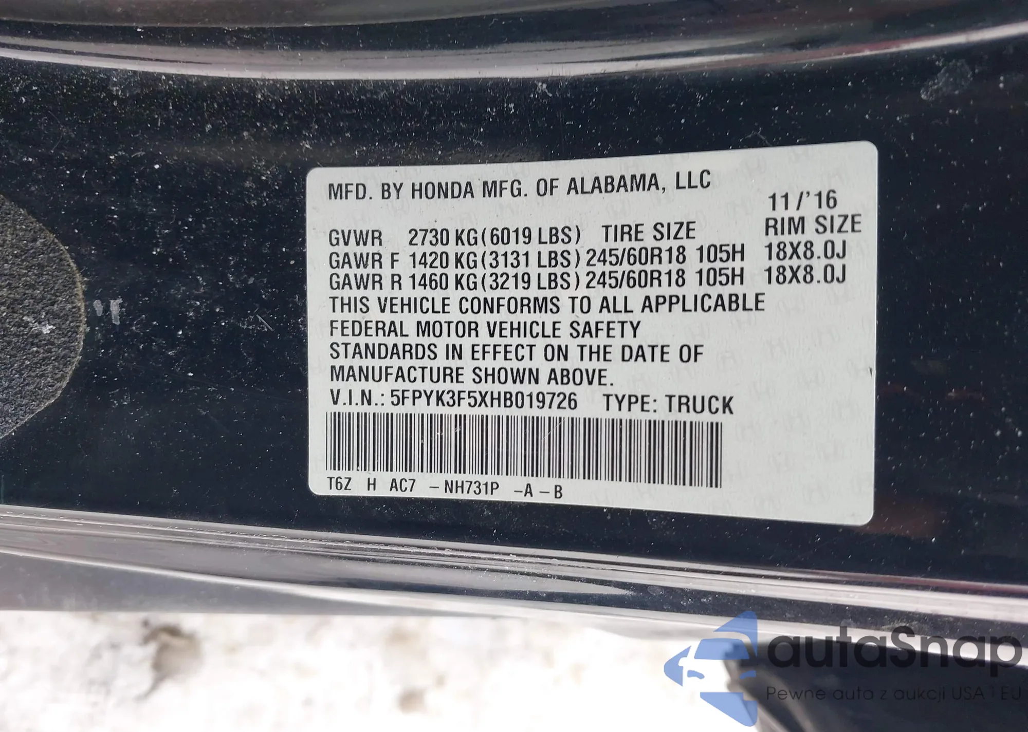 • VIN: 5FPYK3F5XHB019726