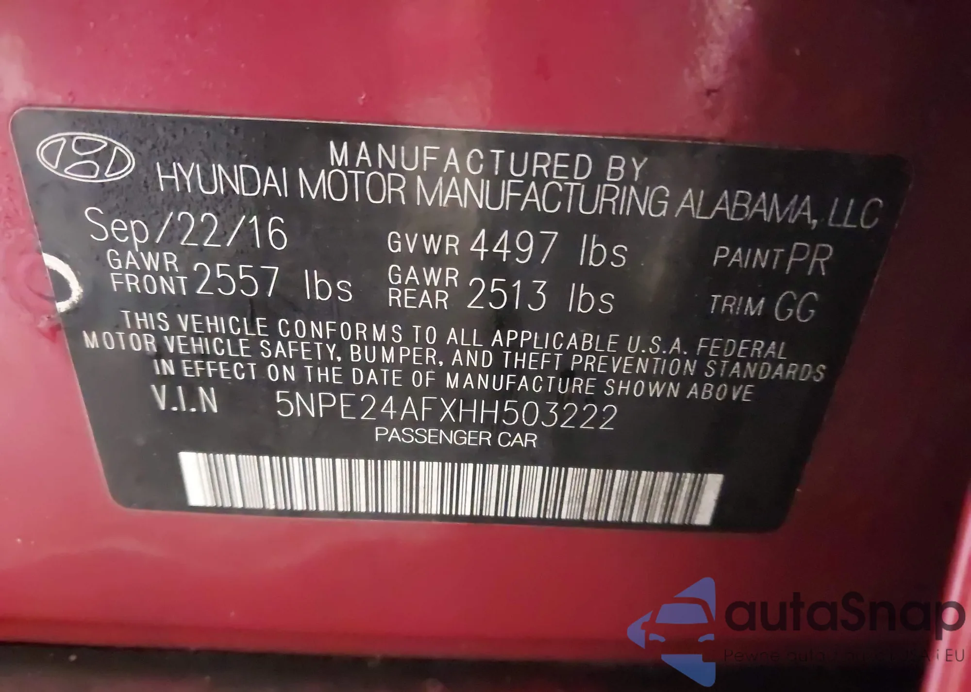 VIN: 5NPE24AFXHH503222