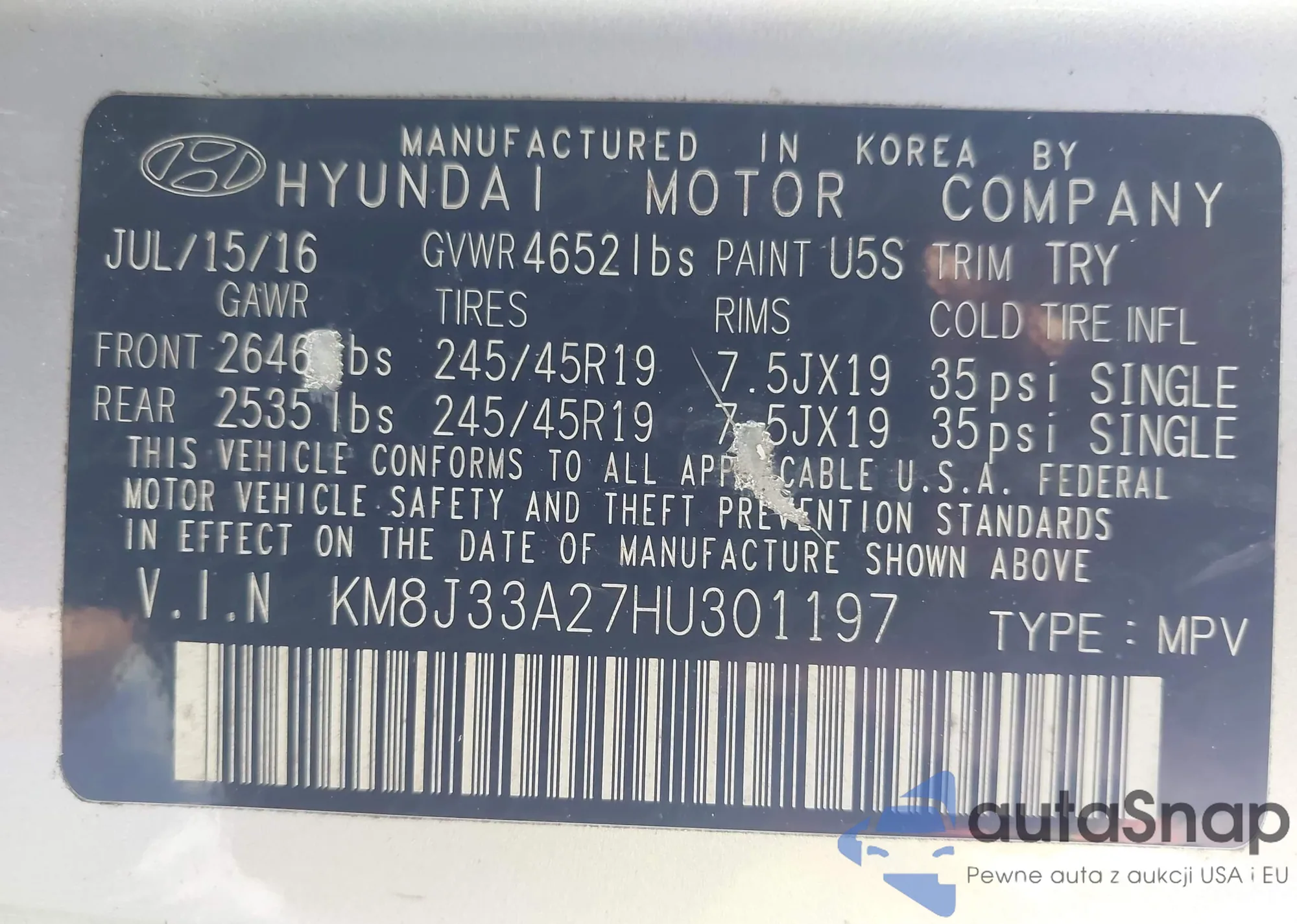 The car Hyundai Tucson 2017 (VIN KM8J33A27HU301197) has not been auctioned before. The documents are clean, and the mileage matches or is below the market average. Sold by an insurance company – we recommend purchase. Delivery to the port will take approx. 6–8 weeks.