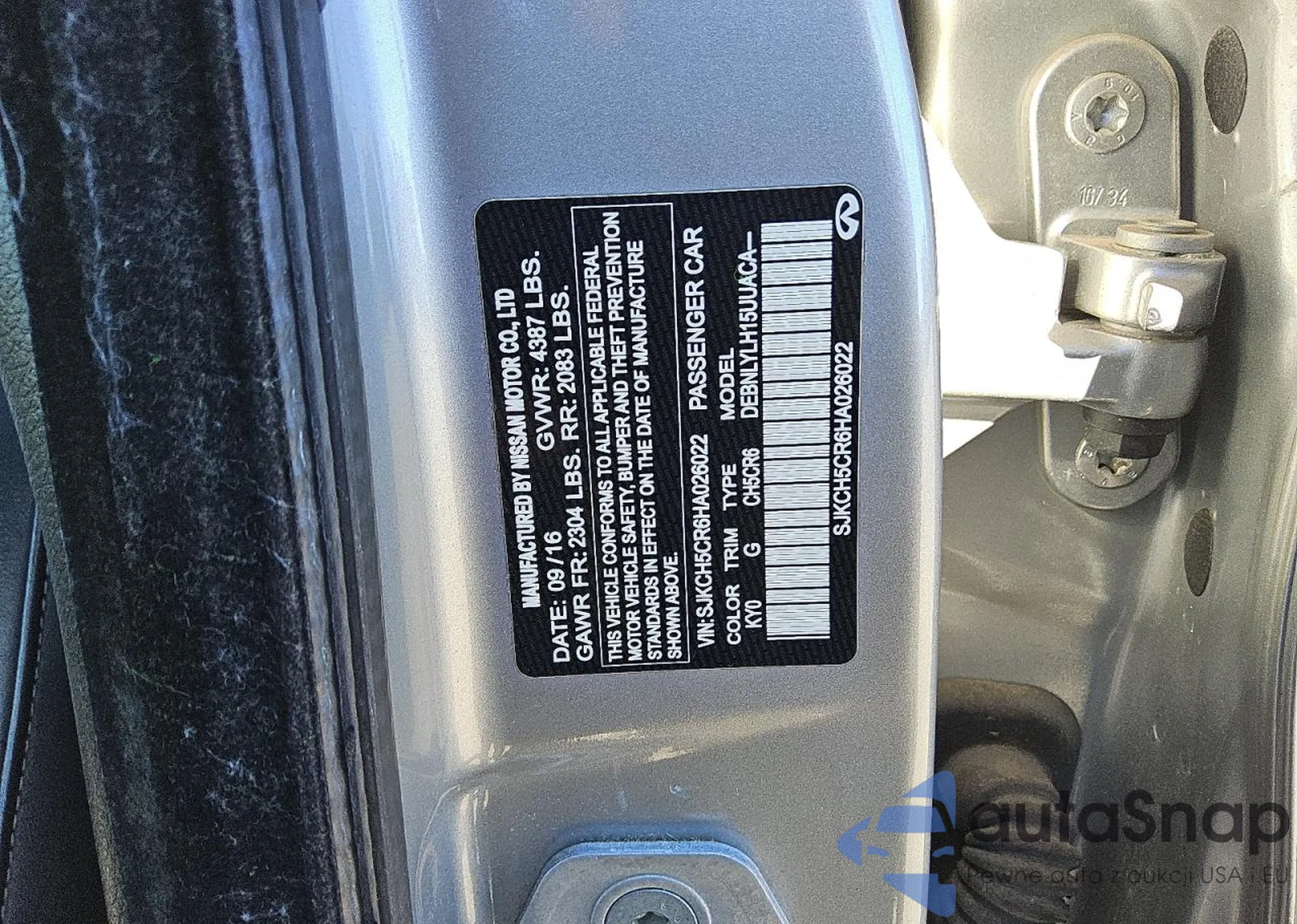 The car Infiniti QX30 2017 (VIN SJKCH5CR6HA026022) has documents that prevent registration. Export and registration may be difficult. Contact AutaSnap experts to find alternatives.