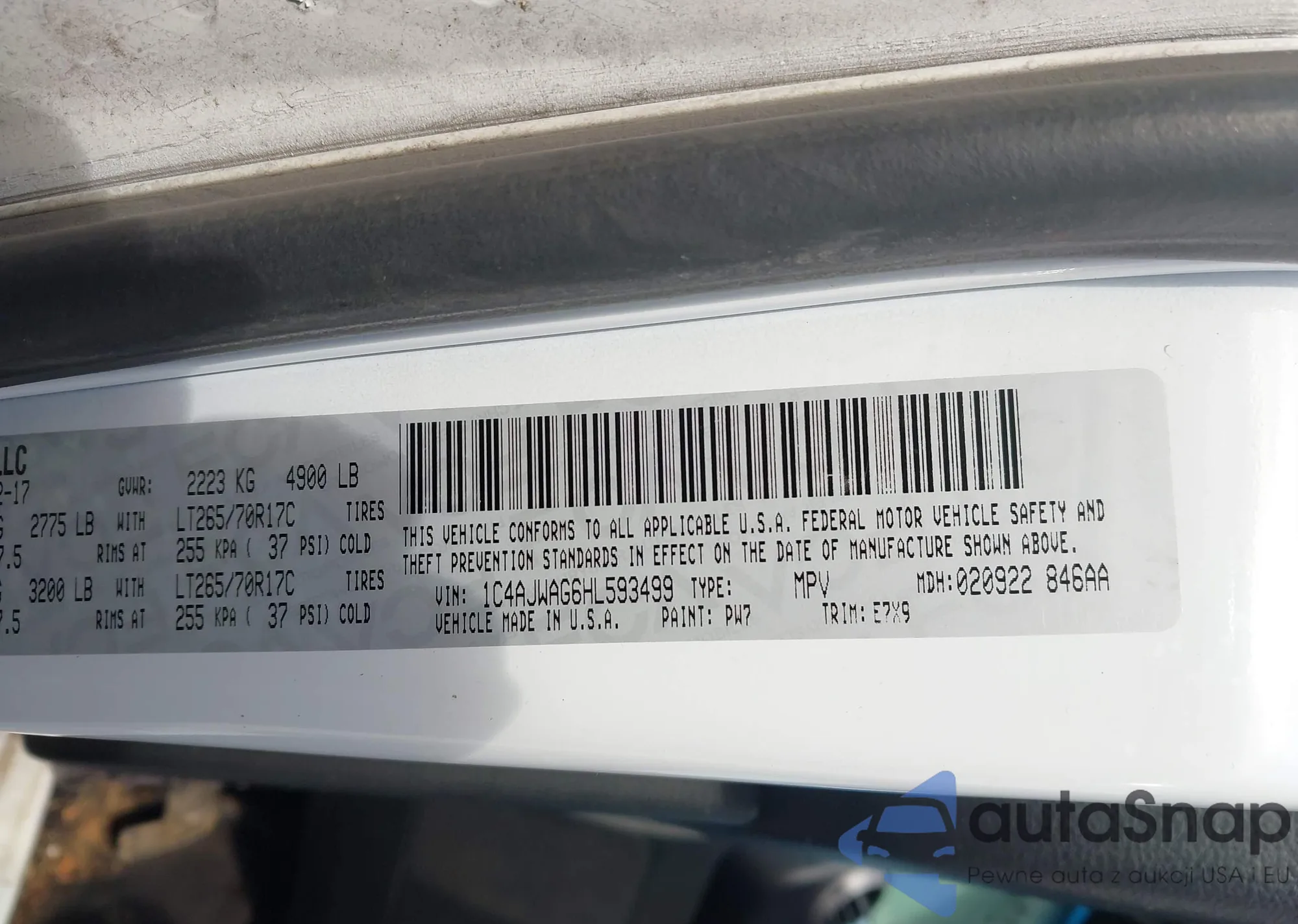 The car Jeep Wrangler 2017 (VIN 1C4AJWAG6HL593499) has not been auctioned before. The documents are clean, and the mileage matches or is below the market average. Sold by an insurance company – we recommend purchase. Delivery to the port will take approx. 6–8 weeks.