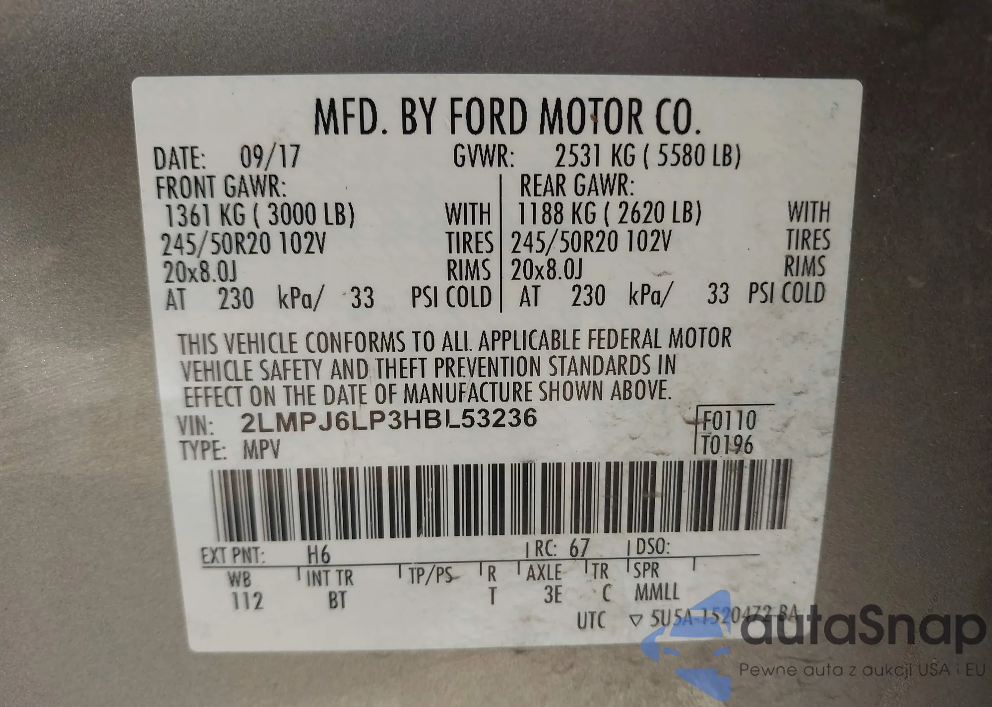 The car Lincoln MKX 2017 (VIN 2LMPJ6LP3HBL53236) has documents that prevent registration. Export and registration may be difficult. Contact AutaSnap experts to find alternatives.