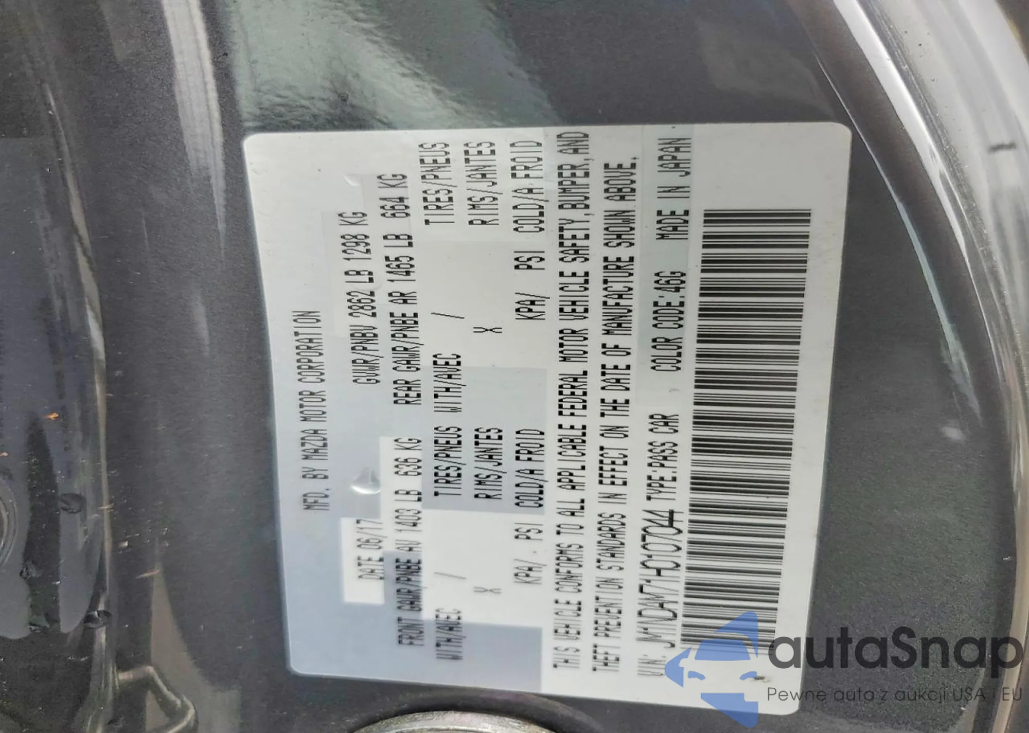 The car Mazda MX-5 2017 (VIN JM1NDAM71H0107044) has documents that prevent registration. Export and registration may be difficult. Contact AutaSnap experts to find alternatives.