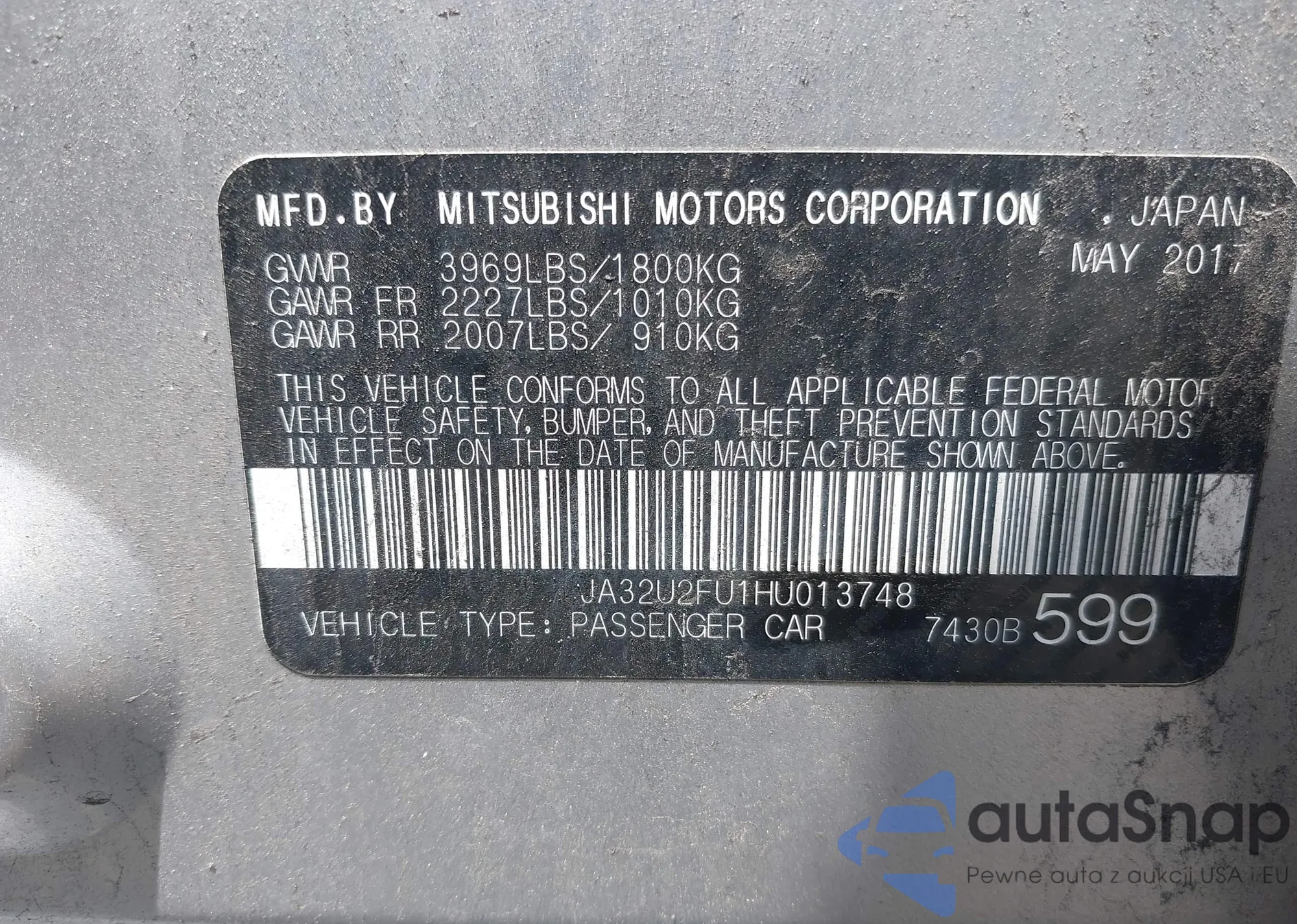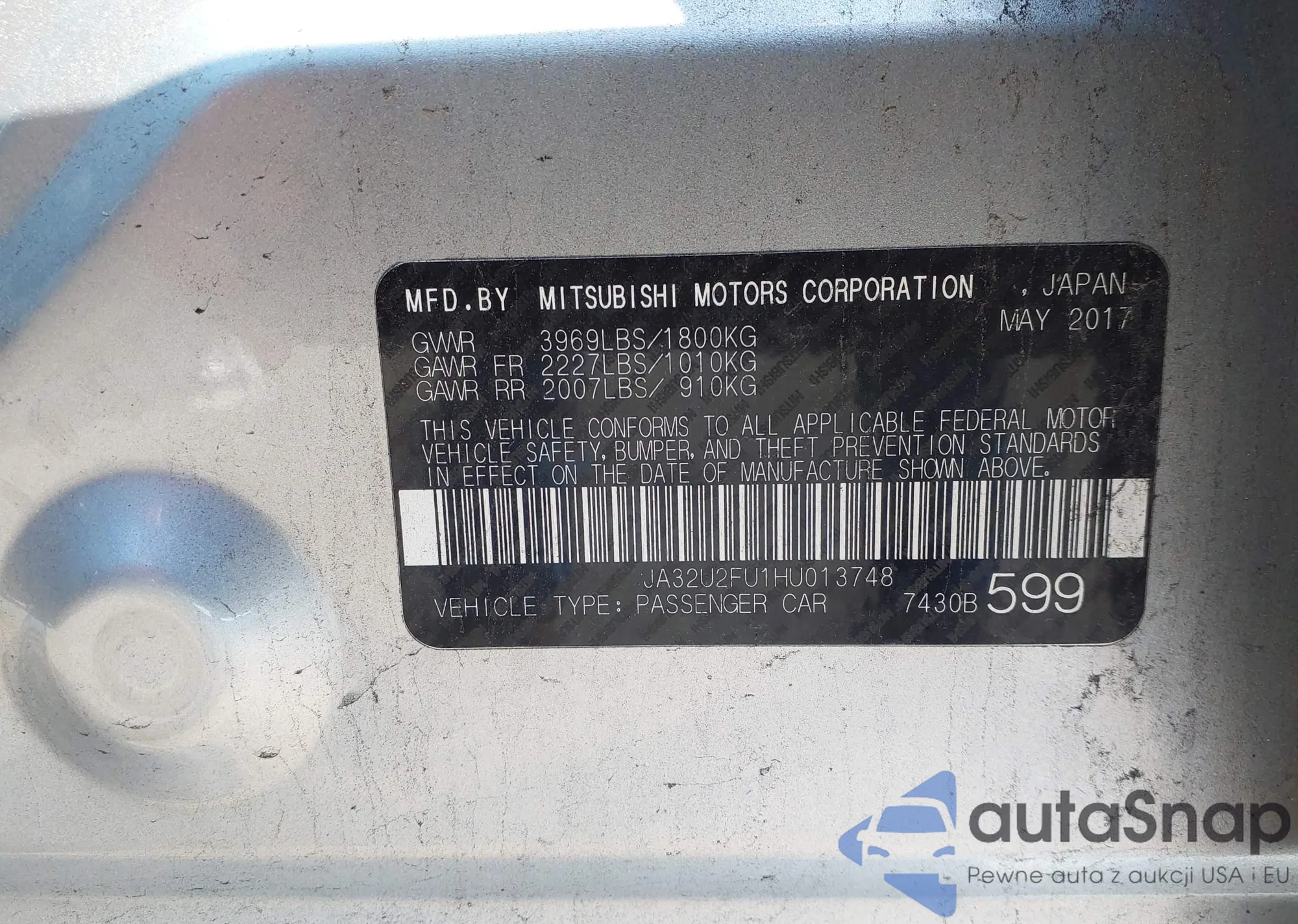 The car Mitsubishi Lancer 2017 (VIN JA32U2FU1HU013748) has not been auctioned before. The documents are clean, and the mileage matches or is below the market average. Sold by an insurance company – we recommend purchase. Delivery to the port will take approx. 6–8 weeks.