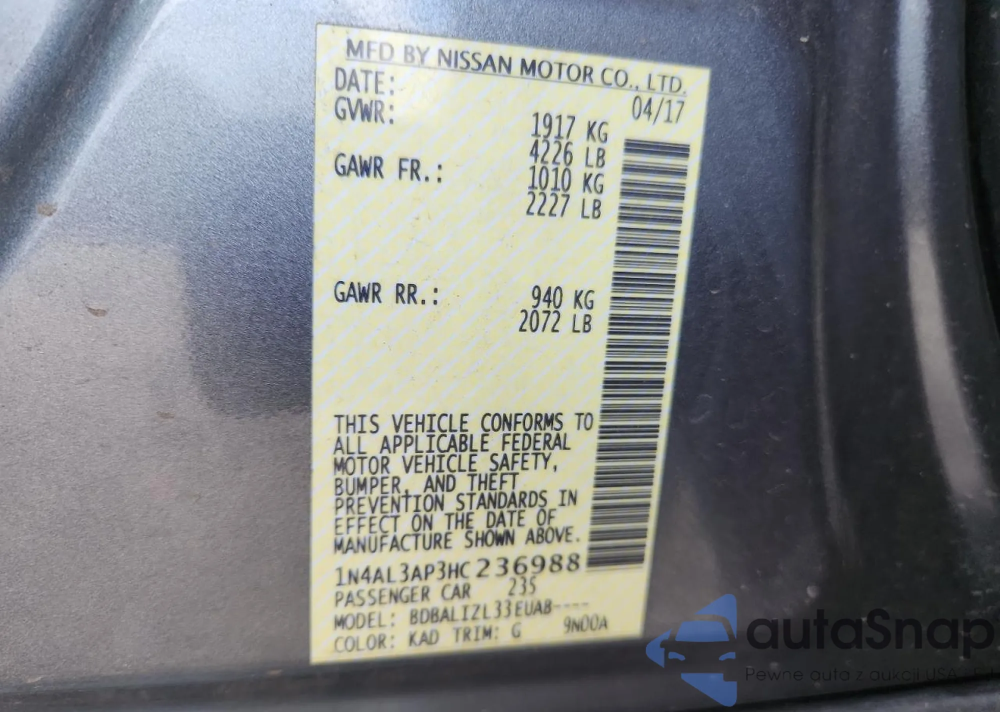 • VIN: 1N4AL3AP3HC236988