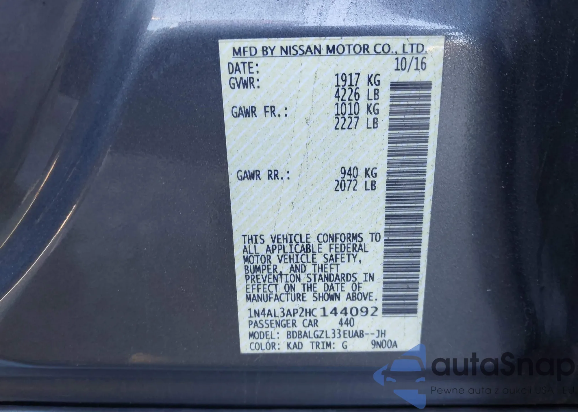 • VIN: 1N4AL3AP2HC144092