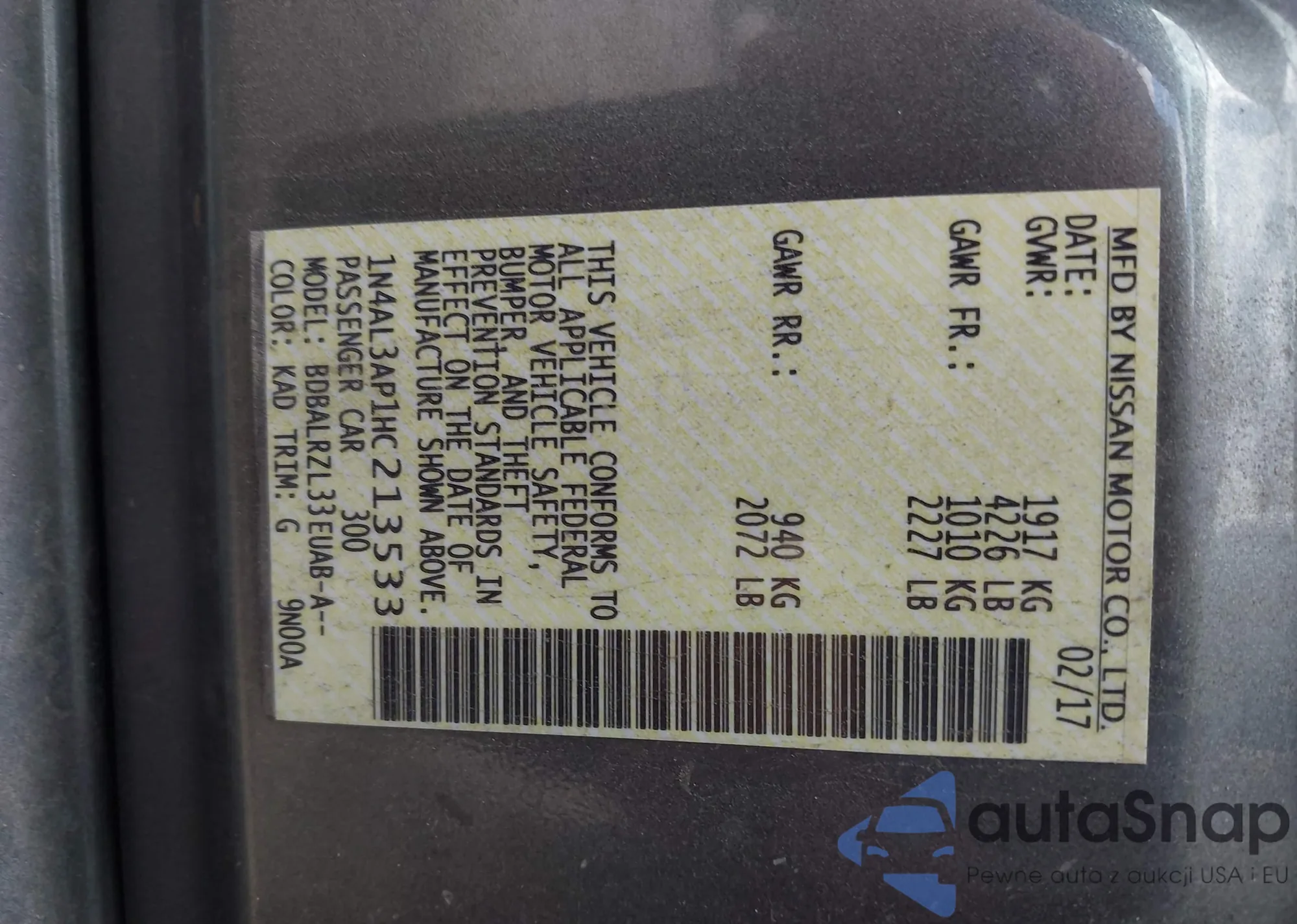 VIN: 1N4AL3AP1HC213533