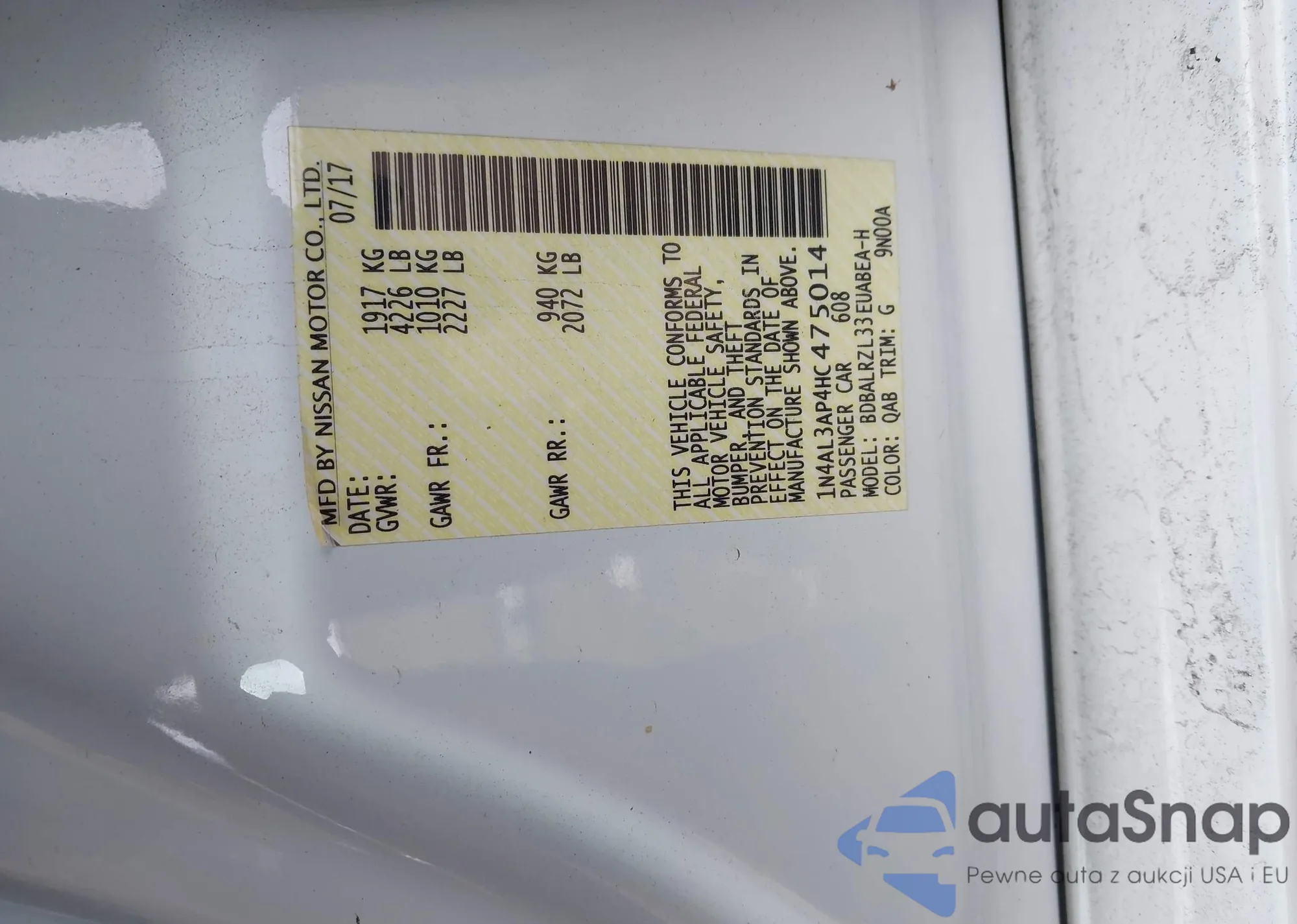 The car Nissan Altima 2017 (VIN 1N4AL3AP4HC475014) has not been auctioned before. The documents are clean, and the mileage matches or is below the market average. Sold by an insurance company – we recommend purchase. Delivery to the port will take approx. 6–8 weeks.
