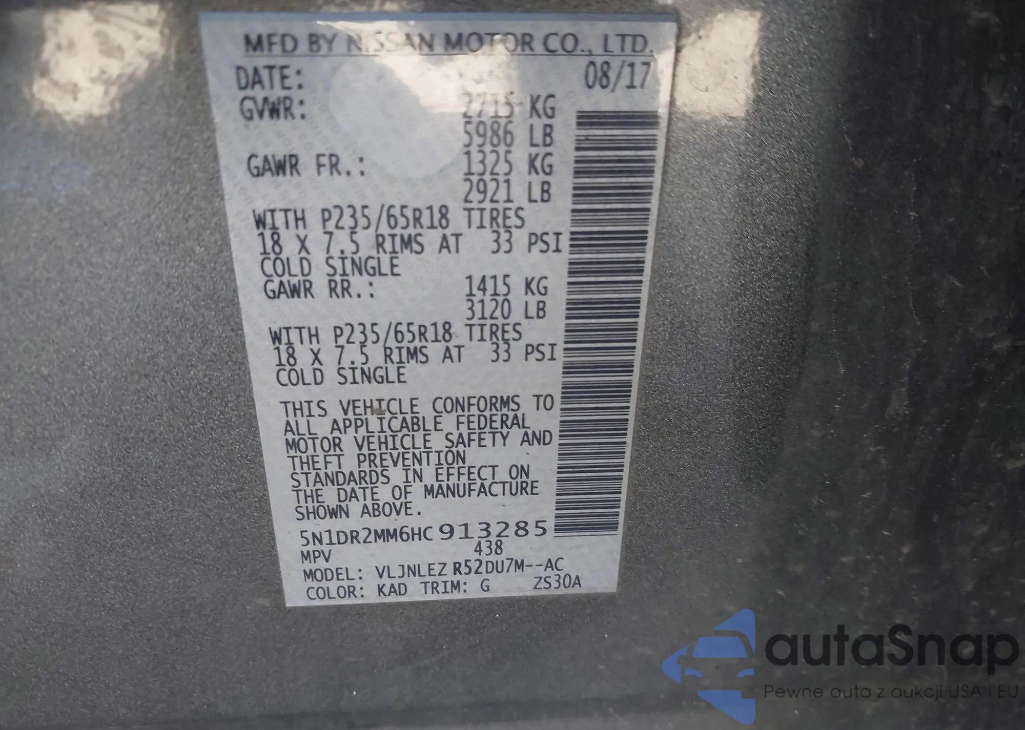 The car Nissan Pathfinder 2017 (VIN 5N1DR2MM6HC913285) has not been auctioned before. The documents are clean, and the mileage matches or is below the market average. Sold by an insurance company – we recommend purchase. Delivery to the port will take approx. 6–8 weeks.