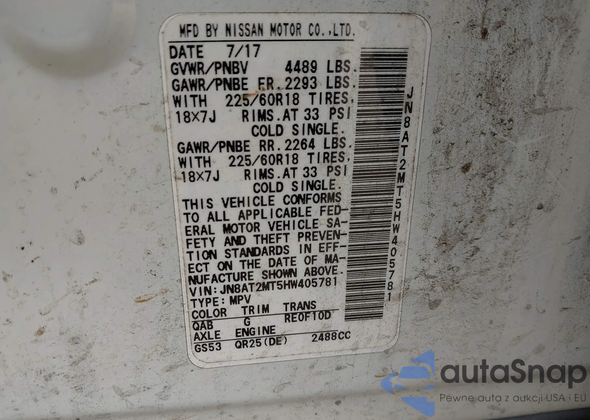 The car Nissan Rogue 2017 (VIN JN8AT2MT5HW405781) is sold by an unverified seller. We recommend checking the Carfax report and confirming registration possibilities before purchase.