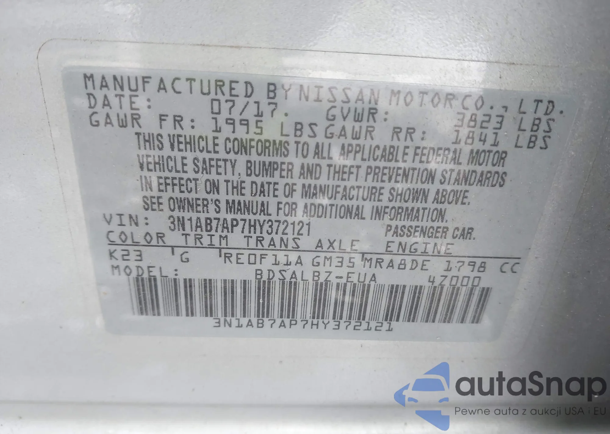 The car Nissan Sentra 2017 (VIN 3N1AB7AP7HY372121) has not been auctioned before. The documents are clean, and the mileage matches or is below the market average. Sold by an insurance company – we recommend purchase. Delivery to the port will take approx. 6–8 weeks.