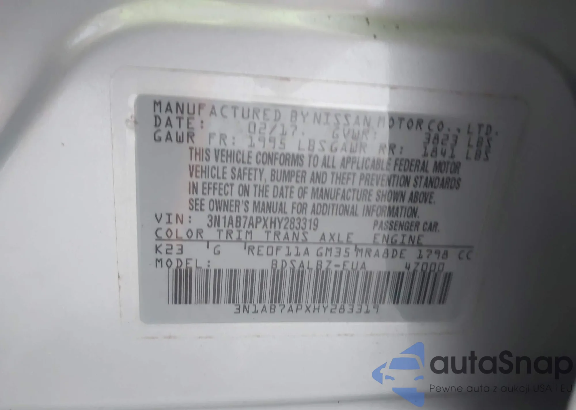 The car Nissan Sentra 2017 (VIN 3N1AB7APXHY283319) has documents that prevent registration. Export and registration may be difficult. Contact AutaSnap experts to find alternatives.