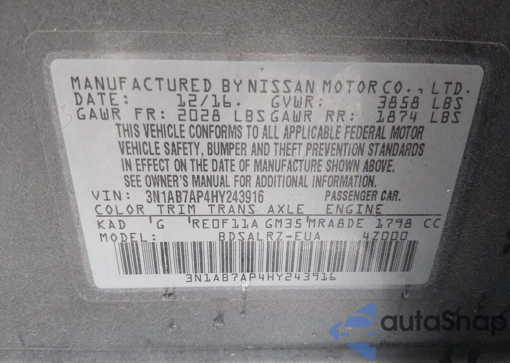 The car Nissan Sentra 2017 (VIN 3N1AB7AP4HY243916) is sold by an unverified seller. We recommend checking the Carfax report and confirming registration possibilities before purchase.