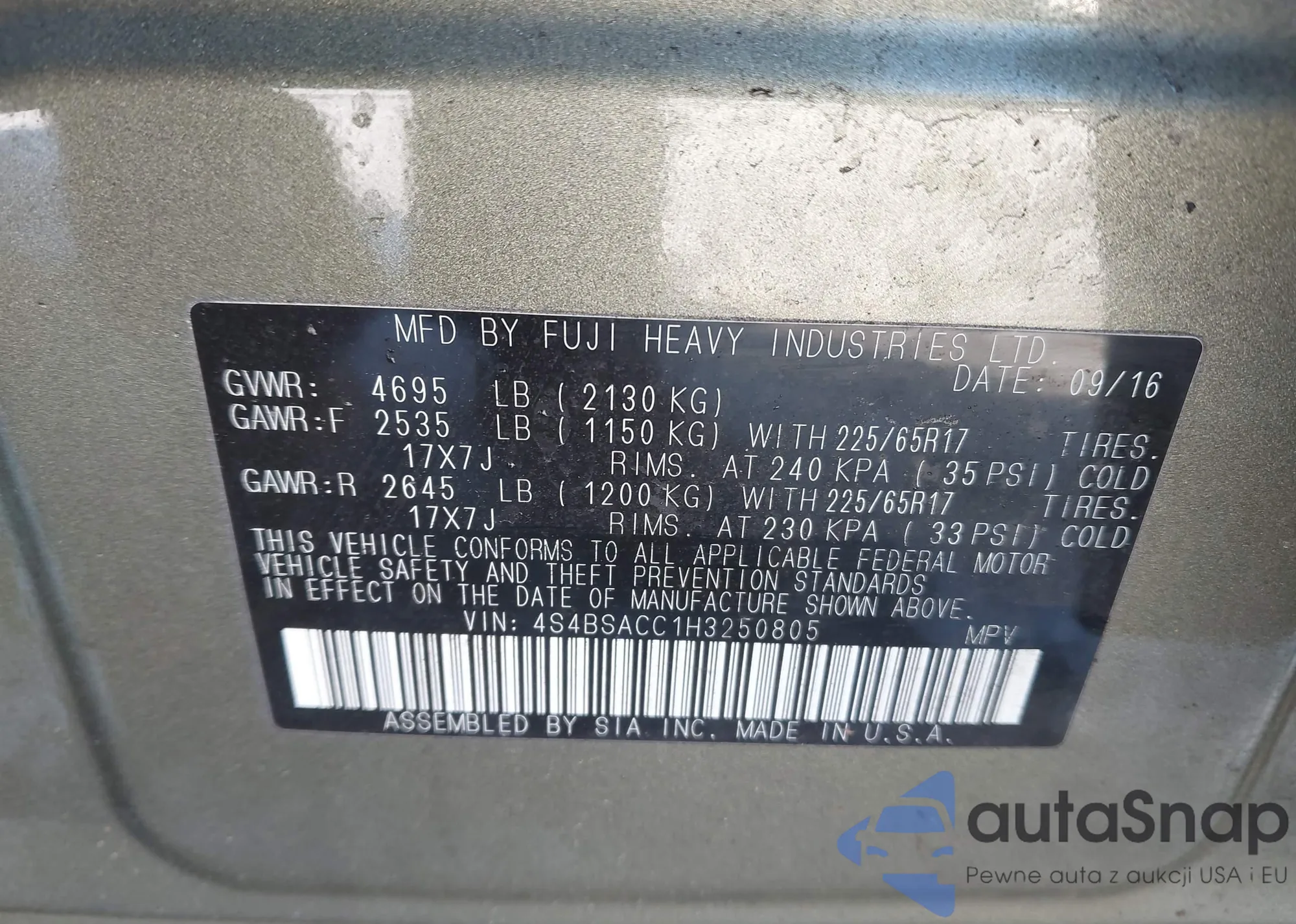 The car Subaru Outback 2017 (VIN 4S4BSACC1H3250805) has not been auctioned before. The documents are clean, and the mileage matches or is below the market average. Sold by an insurance company – we recommend purchase. Delivery to the port will take approx. 6–8 weeks.