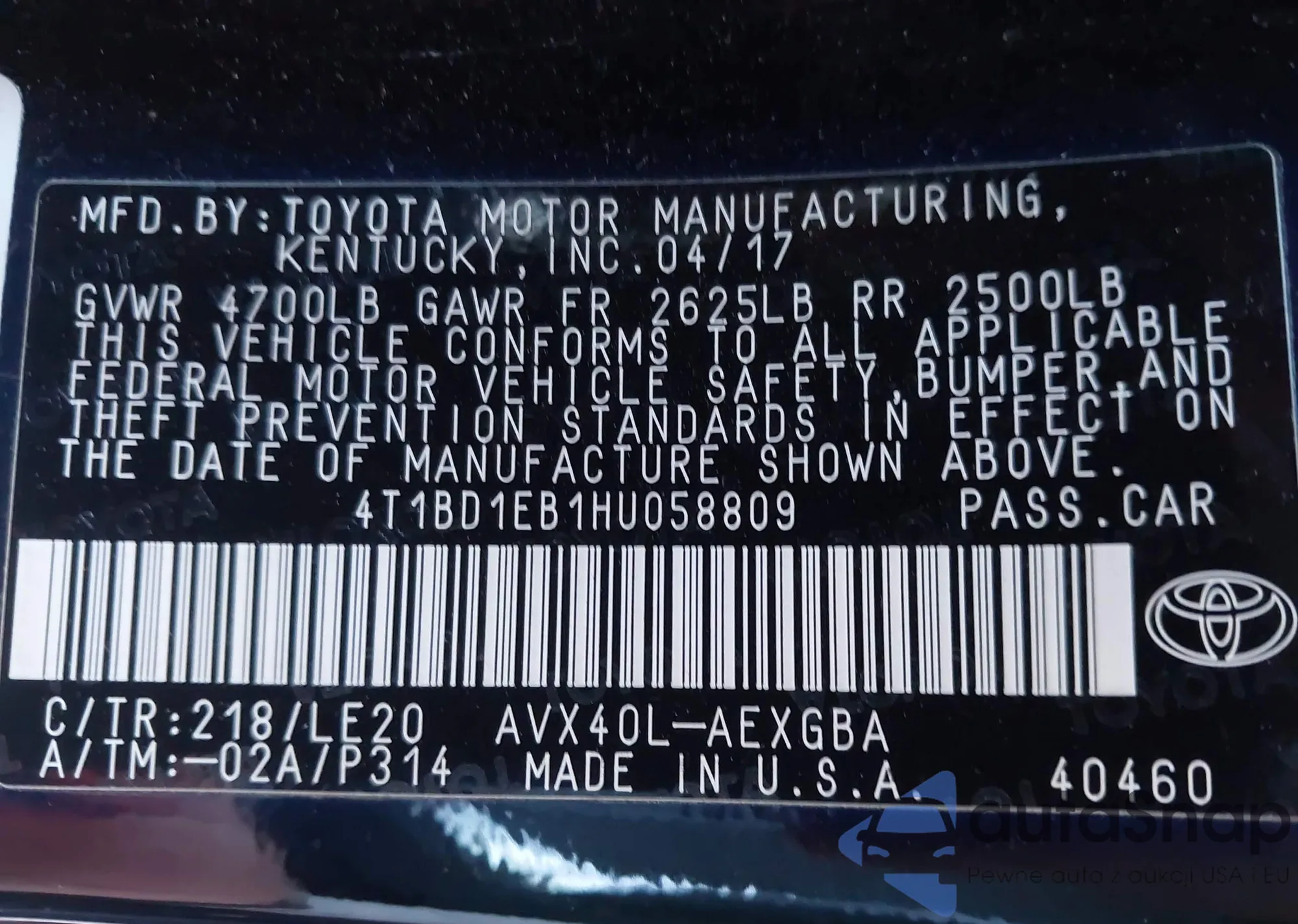 VIN: 4T1BD1EB1HU058809